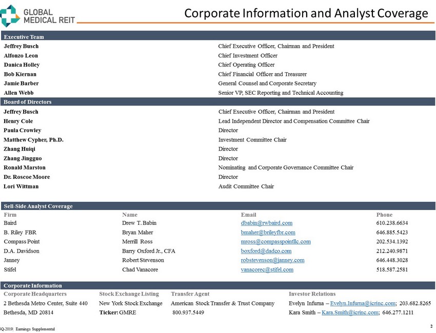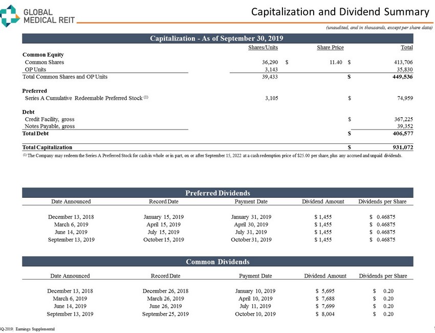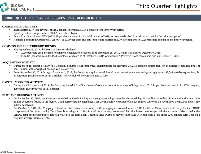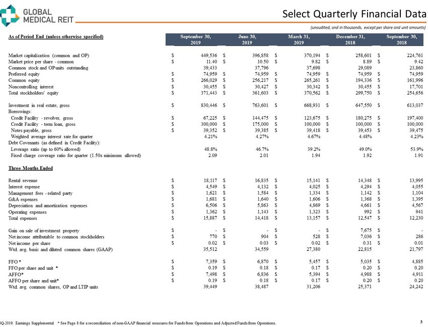 Third Quarter 2019 Earnings Supplemental Three and Nine Months Ended September 30, 2019 www.globalmedicalreit.com NYSE: GMRE