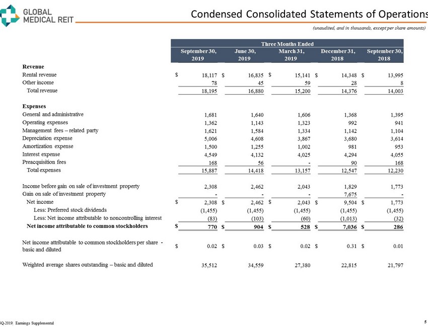 Third Quarter Highlights 4 3Q - 2019| Earnings Supplemental OPERATING HIGHLIGHTS • Third quarter 2019 total revenue of $ 18 . 2 million, increased 29 . 9 % compared to the prior year period . • Quarterly net income per share of $ 0 . 02 on a diluted basis . • Funds from Operations (“FFO ”) of $0.19 per share and unit for the third quarter of 2019, as compared to $0.20 per share and unit for the prior year period. • Adjusted Funds from Operations (“AFFO”) of $0.19 per share and unit for the third quarter of 2019, as compared to $0.20 per share and unit in the prior year period. COMMON AND PREFERRED DIVIDENDS • On September 13, 2019, the Board of Directors declared: • $0.20 per share cash dividend to common stockholders of record as of September 2 5 , 2019, which was paid on October 1 0 , 2019. • $0.46875 per share cash dividend to holders of record as of October 15, 2019 of its Series A Preferred Stock, which was paid on October 31, 2019 . ACQUISITION ACTIVITY • During the third quarter of 2019 , the Company acquired seven properties, encompassing an aggregate 257 , 783 leasable square feet, for an aggregate purchase price of $ 66 . 1 million with a weighted average cap rate of 7 . 7 % . • From September 30 , 2019 through November 6 , 2019 , the Company acquired an additional three properties , encompassing and aggregate 147 , 799 leasable square feet, for an aggregate purchase price of $ 58 . 3 million with a weighted average cap . rate of 7 . 5 % . CAPITAL MARKETS ACTIVITY • During the third quarter of 2019 , the Company issued 1 . 6 million shares of common stock at an average offering price of $ 10 . 94 per share pursuant to its ATM program, generating gross proceeds of $ 17 . 9 million . DEBT AND HEDGING ACTIVITY • On September 30 , 2019 , the Company amended its Credit Facility to, among other things, exercise the remaining $ 75 million accordion feature and add a new $ 150 million accordion feature to the facility . Upon completing the amendment, the Credit Facility consisted of a $ 200 million Revolver , a $ 300 million Term Loan and a $ 150 million accordion . • On October 3 , 2019 , the Company entered into two interest rate swaps with an aggregate notional value of $ 130 million . These swaps effectively fix the LIBOR component of the corresponding Term Loan borrowings at 1 . 21 % . In total the Company has entered into five interest rate swaps with three counterparties to hedge the LIBOR component of its interest rate risk related to the Term Loan . Together, these swaps effectively fix the LIBOR component of the entire $ 300 million Term Loan on a weighted average basis at 2 . 17 % . THIRD QUARTER 2019 AND SUBSEQUENT PERIOD HIGHLIGHTS