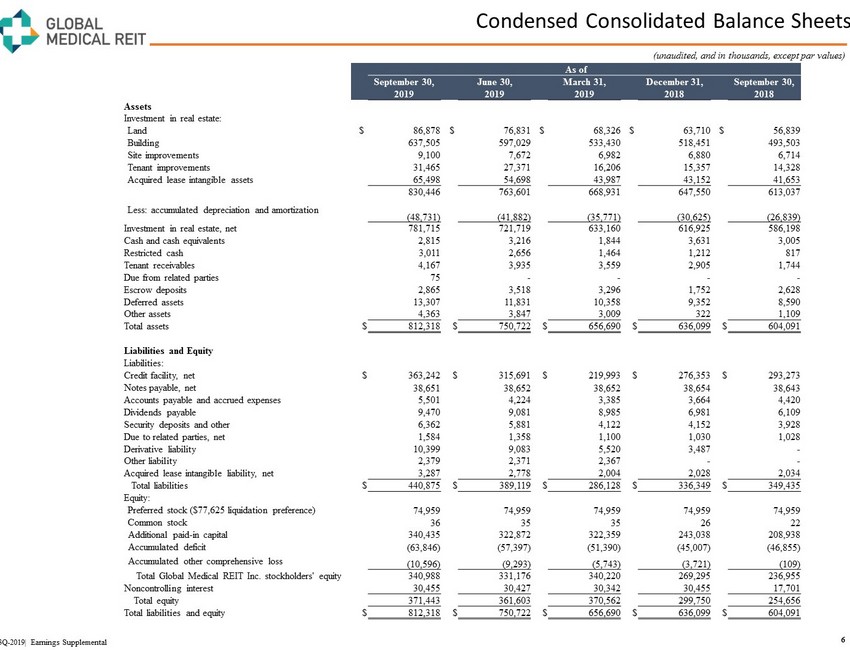 Condensed Consolidated Statements of Operations 5 Three Months Ended September 30, June 30, March 31, December 31, September 30, 2019 2019 2019 2018 2018 Revenue Rental revenue $ 18,117 $ 16,835 $ 15,141 $ 14,348 $ 13,995 Other income 78 45 59 28 8 Total revenue 18,195 16,880 15,200 14,376 14,003 Expenses General and administrative 1,681 1,640 1,606 1,368 1,395 Operating expenses 1,362 1,143 1,323 992 941 Management fees – related party 1,621 1,584 1,334 1,142 1,104 Depreciation expense 5,006 4,608 3,867 3,680 3,614 Amortization expense 1,500 1,255 1,002 981 953 Interest expense 4,549 4,132 4,025 4,294 4,055 Preacquisition fees 168 56 - 90 168 Total expenses 15,887 14,418 13,157 12,547 12,230 Income before gain on sale of investment property 2,308 2,462 2,043 1,829 1,773 Gain on sale of investment property - - - 7,675 - Net income $ 2,308 $ 2,462 $ 2,043 $ 9,504 $ 1,773 Less : Preferred stock dividends ( 1,455) ( 1,455) ( 1,455) ( 1,455) ( 1,455) Less : Net income attributable to noncontrolling interest ( 83) ( 103) ( 60) ( 1,013) ( 32) Net income attributable to common stockholders $ 770 $ 904 $ 528 $ 7,036 $ 286 Net income attributable to common stockholders per share - basic and diluted $ 0.02 $ 0.03 $ 0.02 $ 0.31 $ 0.01 Weighted average shares outstanding – basic and diluted 35,512 34,559 27,380 22,815 21,797 3Q - 2019| Earnings Supplemental (unaudited, and in thousands, except per share amounts)