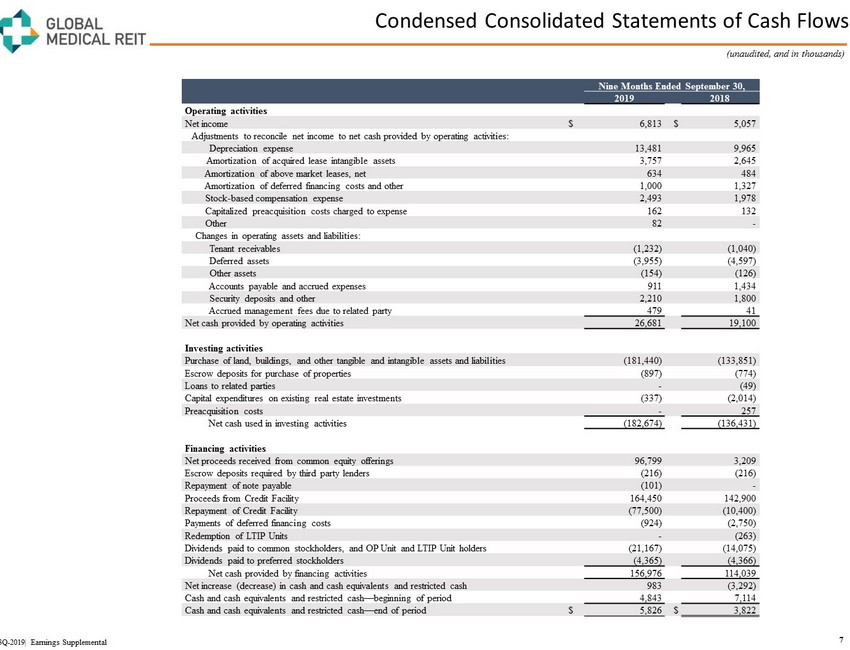 Condensed Consolidated Balance Sheets 6 3Q - 2019| Earnings Supplemental As of September 30, June 30, March 31, December 31, September 30, 2019 2019 2019 2018 2018 Assets Investment in real estate: Land $ 86,878 $ 76,831 $ 68,326 $ 63,710 $ 56,839 Building 637,505 597,029 533,430 518,451 493,503 Site improvements 9,100 7,672 6,982 6,880 6,714 Tenant improvements 31,465 27,371 16,206 15,357 14,328 Acquired lease intangible assets 65,498 54,698 43,987 43,152 41,653 830,446 763,601 668,931 647,550 613,037 Less: accumulated depreciation and amortization (48,731) (41,882) (35,771) (30,625) (26,839) Investment in real estate, net 781,715 721,719 633,160 616,925 586,198 Cash and cash equivalents 2,815 3,216 1,844 3,631 3,005 Restricted cash 3,011 2,656 1,464 1,212 817 Tenant receivables 4,167 3,935 3,559 2,905 1,744 Due from related parties 75 - - - - Escrow deposits 2,865 3,518 3,296 1,752 2,628 Deferred assets 13,307 11,831 10,358 9,352 8,590 Other assets 4,363 3,847 3,009 322 1,109 Total assets $ 812,318 $ 750,722 $ 656,690 $ 636,099 $ 604,091 Liabilities and Equity Liabilities: Credit facility, net $ 363,242 $ 315,691 $ 219,993 $ 276,353 $ 293,273 Notes payable, net 38,651 38,652 38,652 38,654 38,643 Accounts payable and accrued expenses 5,501 4,224 3,385 3,664 4,420 Dividends payable 9,470 9,081 8,985 6,981 6,109 Security deposits and other 6,362 5,881 4,122 4,152 3,928 Due to related parties, net 1,584 1,358 1,100 1,030 1,028 Derivative liability 10,399 9,083 5,520 3,487 - Other liability 2,379 2,371 2,367 - - Acquired lease intangible liability, net 3,287 2,778 2,004 2,028 2,034 Total liabilities $ 440,875 $ 389,119 $ 286,128 $ 336,349 $ 349,435 Equity : Preferred stock ($77,625 liquidation preference) 74,959 74,959 74,959 74,959 74,959 Common stock 36 35 35 26 22 Additional paid - in capital 340,435 322,872 322,359 243,038 208,938 Accumulated deficit ( 63,846) ( 57,397) ( 51,390) ( 45,007) ( 46,855) Accumulated other comprehensive loss ( 10,596) ( 9,293) ( 5,743) ( 3,721) ( 109) Total Global Medical REIT Inc. stockholders' equity 340,988 331,176 340,220 269,295 236,955 Noncontrolling interest 30,455 30,427 30,342 30,455 17,701 Total equity 371,443 361,603 370,562 299,750 254,656 Total liabilities and equity $ 812,318 $ 750,722 $ 656,690 $ 636,099 $ 604,091 (unaudited, and in thousands, except par values)