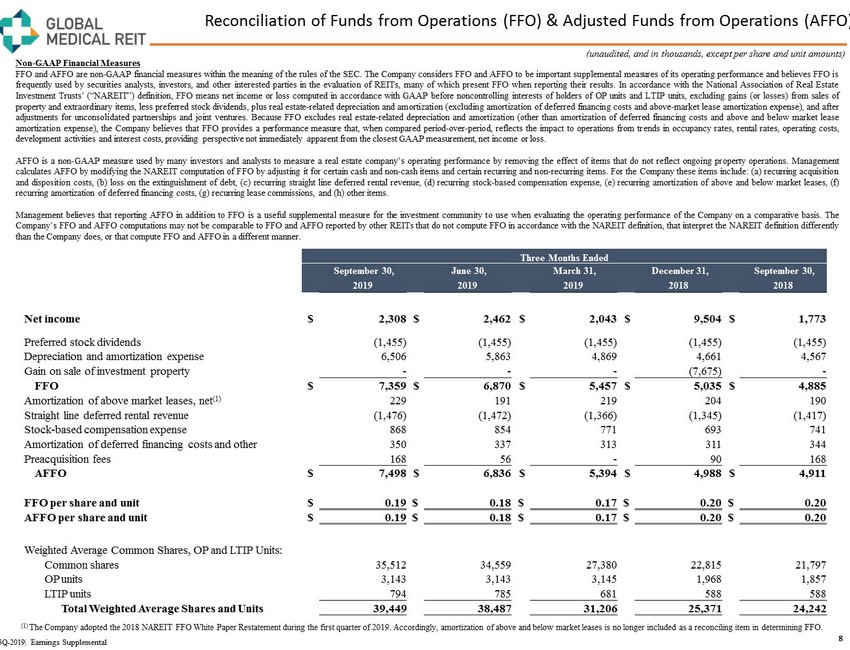 Condensed Consolidated Statements of Cash Flows 7 3Q - 2019| Earnings Supplemental Nine Months Ended September 30, 2019 2018 Operating activities Net income $ 6,813 $ 5,057 Adjustments to reconcile net income to net cash provided by operating activities: Depreciation expense 13,481 9,965 Amortization of acquired lease intangible assets 3,757 2,645 Amortization of above market leases, net 634 484 Amortization of deferred financing costs and other 1,000 1,327 Stock - based compensation expense 2,493 1,978 Capitalized preacquisition costs charged to expense 162 132 Other 82 - Changes in operating assets and liabilities: Tenant receivables (1,232) (1,040) Deferred assets (3,955) (4,597) Other assets (154) (126) Accounts payable and accrued expenses 911 1,434 Security deposits and other 2,210 1,800 Accrued management fees due to related party 479 41 Net cash provided by operating activities 26,681 19,100 Investing activities Purchase of land, buildings, and other tangible and intangible assets and liabilities (181,440) (133,851) Escrow deposits for purchase of properties (897) (774) Loans to related parties - (49) Capital expenditures on existing real estate investments (337) (2,014) Preacquisition costs - 257 Net cash used in investing activities (182,674) (136,431) Financing activities Net proceeds received from common equity offerings 96,799 3,209 Escrow deposits required by third party lenders (216) (216) Repayment of note payable (101) - Proceeds from Credit Facility 164,450 142,900 Repayment of Credit Facility (77,500) (10,400) Payments of deferred financing costs (924) (2,750) Redemption of LTIP Units - (263) Dividends paid to common stockholders, and OP Unit and LTIP Unit holders (21,167) (14,075) Dividends paid to preferred stockholders (4,365) (4,366) Net cash provided by financing activities 156,976 114,039 Net increase (decrease) in cash and cash equivalents and restricted cash 983 (3,292) Cash and cash equivalents and restricted cash — beginning of period 4,843 7,114 Cash and cash equivalents and restricted cash — end of period $ 5,826 $ 3,822 (unaudited, and in thousands)