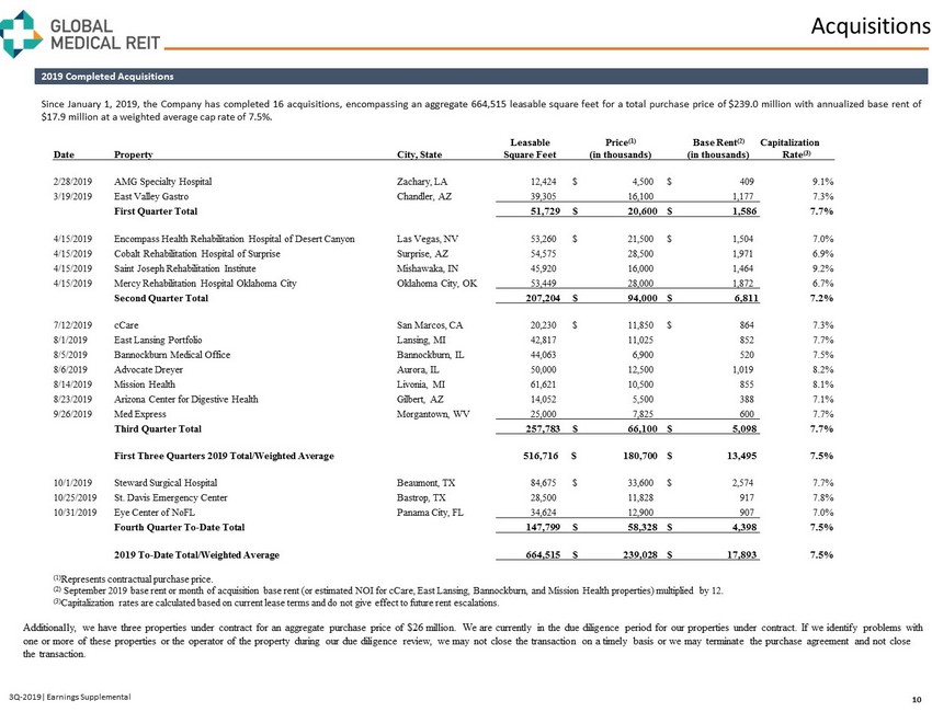 Acquisitions 2019 Completed Acquisitions Since January 1 , 2019 , the Company has completed 16 acquisitions, encompassing an aggregate 664 , 515 leasable square feet for a total purchase price of $ 239 . 0 million with annualized base rent of $ 17 . 9 million at a weighted average cap rate of 7 . 5 % . 10 3Q - 2019| Earnings Supplemental Leasable Price (1) Base Rent (2) Capitalization Date Property City, State Square Feet (in thousands) (in thousands) Rate (3) 2/28/2019 AMG Specialty Hospital Zachary, LA 12,424 $ 4,500 $ 409 9.1% 3/19/2019 East Valley Gastro Chandler, AZ 39,305 16,100 1,177 7.3% First Quarter Total 51,729 $ 20,600 $ 1,586 7.7% 4/15/2019 Encompass Health Rehabilitation Hospital of Desert Canyon Las Vegas, NV 53,260 $ 21,500 $ 1,504 7.0% 4/15/2019 Cobalt Rehabilitation Hospital of Surprise Surprise, AZ 54,575 28,500 1,971 6.9% 4/15/2019 Saint Joseph Rehabilitation Institute Mishawaka, IN 45,920 16,000 1,464 9.2% 4/15/2019 Mercy Rehabilitation Hospital Oklahoma City Oklahoma City, OK 53,449 28,000 1,872 6.7% Second Quarter Total 207,204 $ 94,000 $ 6,811 7.2% 7/12/2019 cCare San Marcos, CA 20,230 $ 11,850 $ 864 7.3% 8/1/2019 East Lansing Portfolio Lansing, MI 42,817 11,025 852 7.7% 8/5/2019 Bannockburn Medical Office Bannockburn, IL 44,063 6,900 520 7.5% 8/6/2019 Advocate Dreyer Aurora, IL 50,000 12,500 1,019 8.2% 8/14/2019 Mission Health Livonia, MI 61,621 10,500 855 8.1% 8/23/2019 Arizona Center for Digestive Health Gilbert, AZ 14,052 5,500 388 7.1% 9/26/2019 Med Express Morgantown, WV 25,000 7,825 600 7.7% Third Quarter Total 257,783 $ 66,100 $ 5,098 7.7% First Three Quarters 2019 Total/Weighted Average 516,716 $ 180,700 $ 13,495 7.5% 10/1/2019 Steward Surgical Hospital Beaumont, TX 84,675 $ 33,600 $ 2,574 7.7% 10/25/2019 St. Davis Emergency Center Bastrop, TX 28,500 11,828 917 7.8% 10/31/2019 Eye Center of NoFL Panama City, FL 34,624 12,900 907 7.0% Fourth Quarter To - Date Total 147,799 $ 58,328 $ 4,398 7.5% 2019 To - Date Total/Weighted Average 664,515 $ 239,028 $ 17,893 7.5% (1) Represents contractual purchase price. (2) September 2019 base rent or month of acquisition base rent (or estimated NOI for cCare , East Lansing, Bannockburn, and Mission Health properties) multiplied by 12. (3) Capitalization rates are calculated based on current lease terms and do not give effect to future rent escalations. Additionally, we have three properties under contract for an aggregate purchase price of $26 million. We are currently in the du e diligence period for our properties under contract. If we identify problems with one or more of these properties or the operator of the property during our due diligence review, we may not close the transac tio n on a timely basis or we may terminate the purchase agreement and not close the transaction.