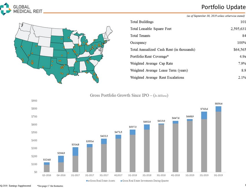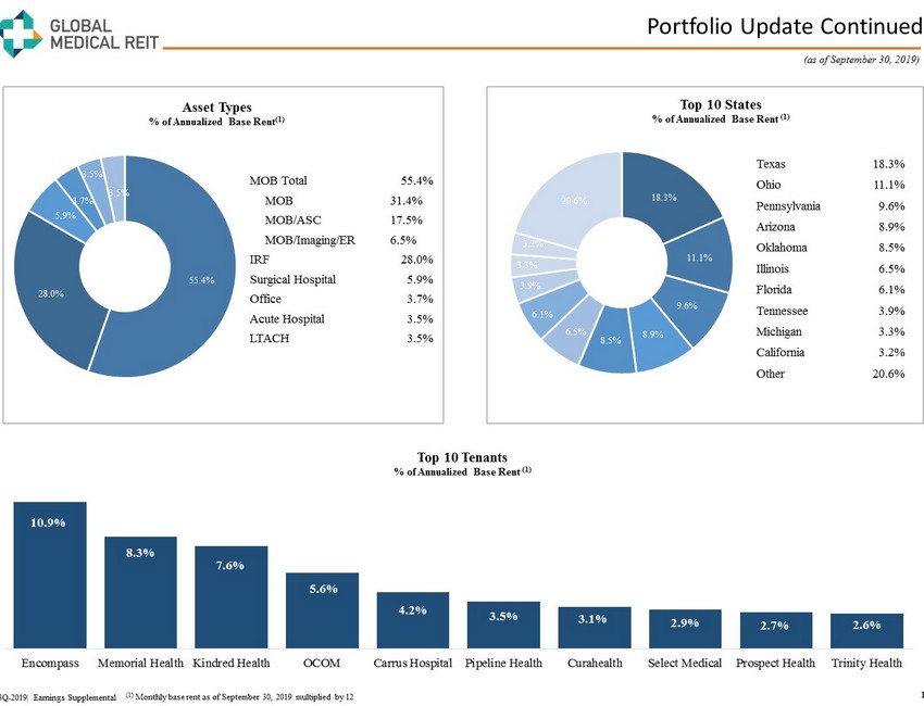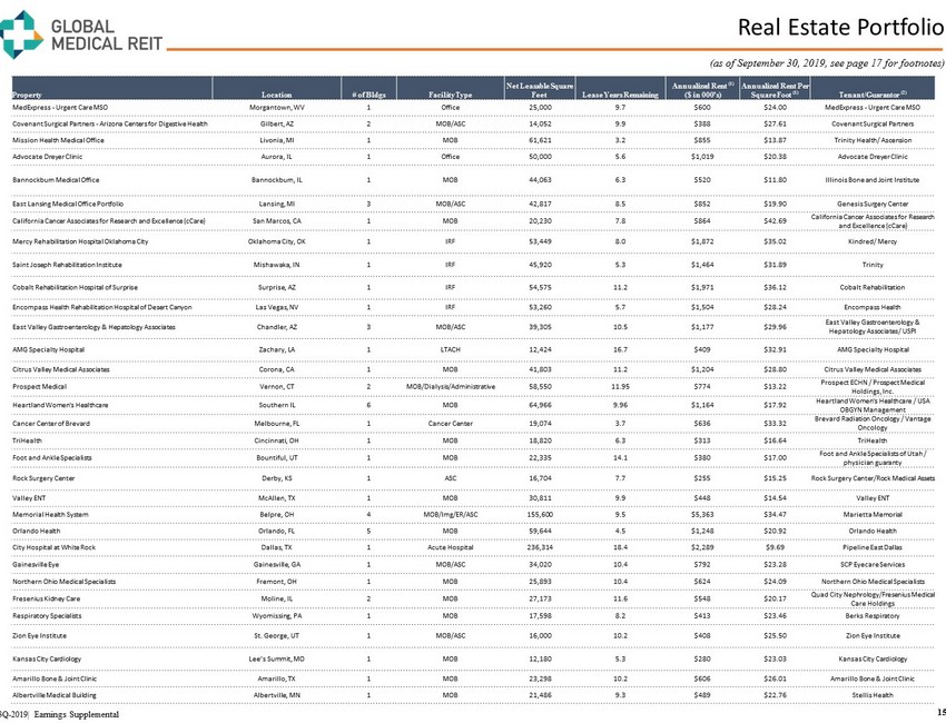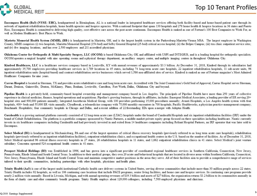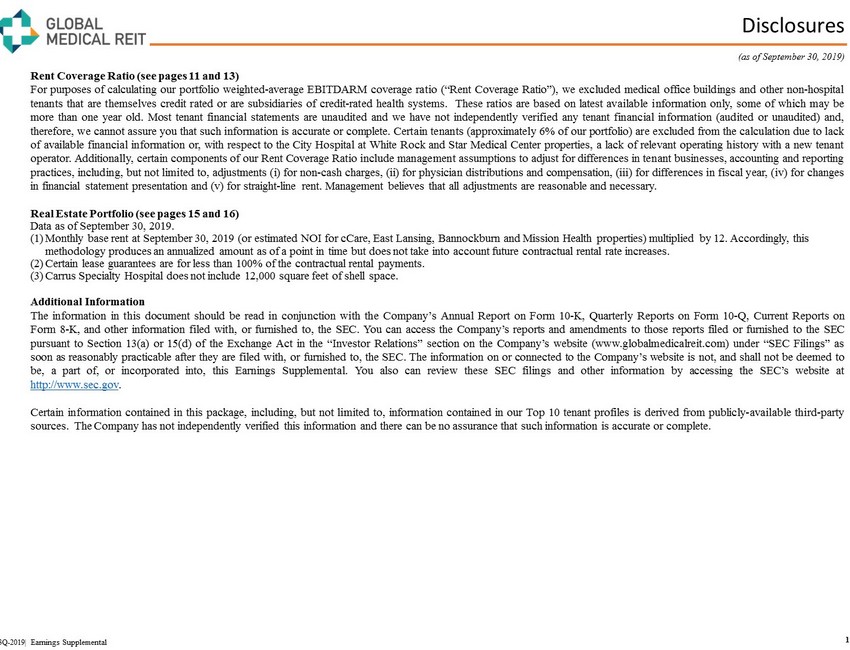 Disclosures Rent Coverage Ratio (see pages 11 and 13 ) For purposes of calculating our portfolio weighted - average EBITDARM coverage ratio (“Rent Coverage Ratio”), we excluded medical office buildings and other non - hospital tenants that are themselves credit rated or are subsidiaries of credit - rated health systems . These ratios are based on latest available information only, some of which may be more than one year old . Most tenant financial statements are unaudited and we have not independently verified any tenant financial information (audited or unaudited) and, therefore, we cannot assure you that such information is accurate or complete . Certain tenants (approximately 6 % of our portfolio) are excluded from the calculation due to lack of available financial information or, with respect to the City Hospital at White Rock and Star Medical Center properties, a lack of relevant operating history with a new tenant operator . Additionally , certain components of our Rent Coverage Ratio include management assumptions to adjust for differences in tenant businesses, accounting and reporting practices, including, but not limited to, adjustments (i) for non - cash charges, (ii) for physician distributions and compensation, (iii) for differences in fiscal year, (iv) for changes in financial statement presentation and (v) for straight - line rent . Management believes that all adjustments are reasonable and necessary . Real Estate Portfolio (see pages 15 and 16 ) Data as of September 30, 2019. (1) Monthly base rent at September 30 , 2019 (or estimated NOI for cCare , East Lansing, Bannockburn and Mission Health properties) multiplied by 12 . Accordingly , this methodology produces an annualized amount as of a point in time but does not take into account future contractual rental rate in creases. (2) Certain lease guarantees are for less than 100% of the contractual rental payments. (3) Carrus Specialty Hospital does not include 12,000 square feet of shell space. Additional Information The information in this document should be read in conjunction with the Company’s Annual Report on Form 10 - K, Quarterly Reports on Form 10 - Q, Current Reports on Form 8 - K, and other information filed with, or furnished to, the SEC . You can access the Company’s reports and amendments to those reports filed or furnished to the SEC pursuant to Section 13 (a) or 15 (d) of the Exchange Act in the “Investor Relations” section on the Company’s website (www . globalmedicalreit . com) under “SEC Filings” as soon as reasonably practicable after they are filed with, or furnished to, the SEC . The information on or connected to the Company’s website is not, and shall not be deemed to be, a part of, or incorporated into, this Earnings Supplemental . You also can review these SEC filings and other information by accessing the SEC’s website at http : //www . sec . gov . Certain information contained in this package, including, but not limited to, information contained in our Top 10 tenant profiles is derived from publicly - available third - party sources . The Company has not independently verified this information and there can be no assurance that such information is accurate or complete . 17 (as of September 30, 2019) 3Q - 2019| Earnings Supplemental