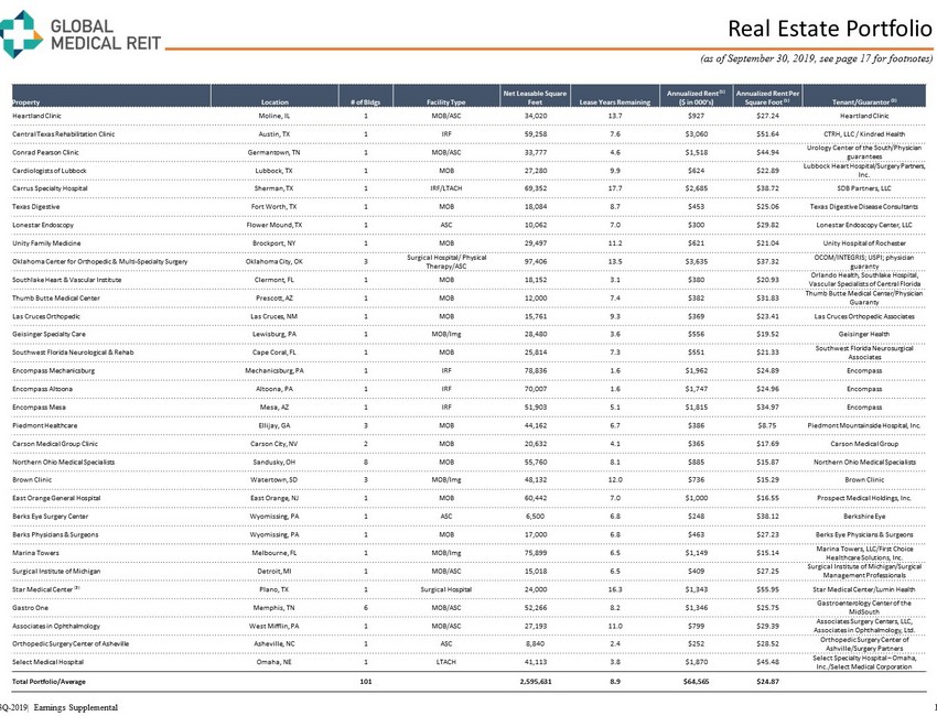 Real Estate Portfolio 16 (as of September 30, 2019, see page 17 for footnotes) Property Location # of Bldgs Facility Type Net Leasable Square Feet Lease Years Remaining Annualized Rent (1) ($ in 000’s) Annualized Rent Per Square Foot (1) Tenant/Guarantor (2) Heartland Clinic Moline, IL 1 MOB/ASC 34,020 13.7 $927 $27.24 Heartland Clinic Central Texas Rehabilitation Clinic Austin, TX 1 IRF 59,258 7.6 $3,060 $51.64 CTRH, LLC / Kindred Health Conrad Pearson Clinic Germantown, TN 1 MOB/ASC 33,777 4.6 $1,518 $44.94 Urology Center of the South/Physician guarantees Cardiologists of Lubbock Lubbock, TX 1 MOB 27,280 9.9 $624 $22.89 Lubbock Heart Hospital/Surgery Partners, Inc. Carrus Specialty Hospital Sherman, TX 1 IRF/LTACH 69,352 17.7 $2,685 $38.72 SDB Partners, LLC Texas Digestive Fort Worth, TX 1 MOB 18,084 8.7 $453 $25.06 Texas Digestive Disease Consultants Lonestar Endoscopy Flower Mound, TX 1 ASC 10,062 7.0 $300 $29.82 Lonestar Endoscopy Center, LLC Unity Family Medicine Brockport, NY 1 MOB 29,497 11.2 $621 $21.04 Unity Hospital of Rochester Oklahoma Center for Orthopedic & Multi - Specialty Surgery Oklahoma City, OK 3 Surgical Hospital/ Physical Therapy/ASC 97,406 13.5 $3,635 $37.32 OCOM/INTEGRIS; USPI; physician guaranty Southlake Heart & Vascular Institute Clermont, FL 1 MOB 18,152 3.1 $380 $20.93 Orlando Health, Southlake Hospital, Vascular Specialists of Central Florida Thumb Butte Medical Center Prescott, AZ 1 MOB 12,000 7.4 $382 $31.83 Thumb Butte Medical Center/Physician Guaranty Las Cruces Orthopedic Las Cruces, NM 1 MOB 15,761 9.3 $369 $23.41 Las Cruces Orthopedic Associates Geisinger Specialty Care Lewisburg, PA 1 MOB/Img 28,480 3.6 $556 $19.52 Geisinger Health Southwest Florida Neurological & Rehab Cape Coral, FL 1 MOB 25,814 7.3 $551 $21.33 Southwest Florida Neurosurgical Associates Encompass Mechanicsburg Mechanicsburg, PA 1 IRF 78,836 1.6 $1,962 $24.89 Encompass Encompass Altoona Altoona, PA 1 IRF 70,007 1.6 $1,747 $24.96 Encompass Encompass Mesa Mesa, AZ 1 IRF 51,903 5.1 $1,815 $34.97 Encompass Piedmont Healthcare Ellijay, GA 3 MOB 44,162 6.7 $386 $8.75 Piedmont Mountainside Hospital, Inc. Carson Medical Group Clinic Carson City, NV 2 MOB 20,632 4.1 $365 $17.69 Carson Medical Group Northern Ohio Medical Specialists Sandusky, OH 8 MOB 55,760 8.1 $885 $15.87 Northern Ohio Medical Specialists Brown Clinic Watertown, SD 3 MOB/Img 48,132 12.0 $736 $15.29 Brown Clinic East Orange General Hospital East Orange, NJ 1 MOB 60,442 7.0 $1,000 $16.55 Prospect Medical Holdings, Inc. Berks Eye Surgery Center Wyomissing, PA 1 ASC 6,500 6.8 $248 $38.12 Berkshire Eye Berks Physicians & Surgeons Wyomissing, PA 1 MOB 17,000 6.8 $463 $27.23 Berks Eye Physicians & Surgeons Marina Towers Melbourne, FL 1 MOB/Img 75,899 6.5 $1,149 $15.14 Marina Towers, LLC/First Choice Healthcare Solutions, Inc. Surgical Institute of Michigan Detroit, MI 1 MOB/ASC 15,018 6.5 $409 $27.25 Surgical Institute of Michigan/Surgical Management Professionals Star Medical Center (3) Plano, TX 1 Surgical Hospital 24,000 16.3 $1,343 $55.95 Star Medical Center/Lumin Health Gastro One Memphis, TN 6 MOB/ASC 52,266 8.2 $1,346 $25.75 Gastroenterology Center of the MidSouth Associates in Ophthalmology West Mifflin, PA 1 MOB/ASC 27,193 11.0 $799 $29.39 Associates Surgery Centers, LLC, Associates in Ophthalmology, Ltd. Orthopedic Surgery Center of Asheville Asheville, NC 1 ASC 8,840 2.4 $252 $28.52 Orthopedic Surgery Center of Ashville/Surgery Partners Select Medical Hospital Omaha, NE 1 LTACH 41,113 3.8 $1,870 $45.48 Select Specialty Hospital – Omaha, Inc./Select Medical Corporation Total Portfolio/Average 101 2,595,631 8.9 $64,565 $24.87 3Q - 2019| Earnings Supplemental