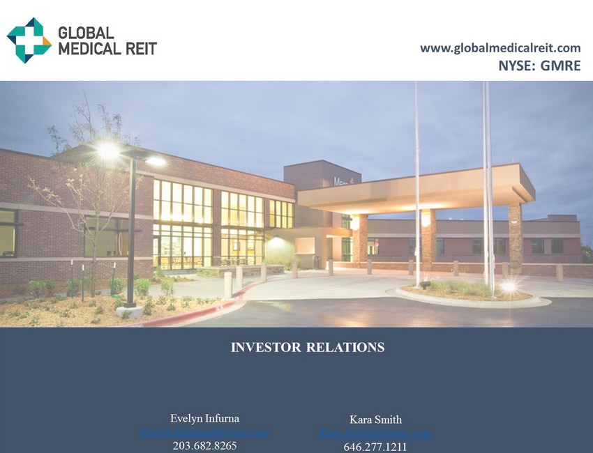 Evelyn Infurna Evelyn.Infurna@icrinc.com 203.682.8265 Kara Smith Kara.Smith@icrinc.com 646.277.1211 www.globalmedicalreit.com NYSE: GMRE INVESTOR RELATIONS