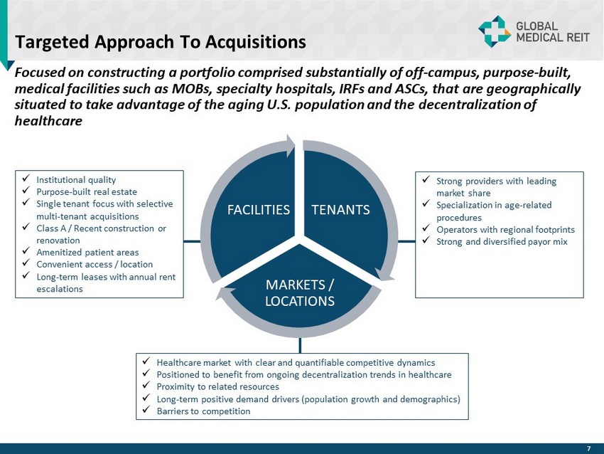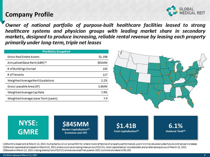 Forward - Looking Statements 1 This presentation is for informational purposes only and does not constitute an offer to sell, or a solicitation of offers to purchase, Global Medical REIT Inc . ’s (the “Company”, or “GMRE”) securities . The information contained in this presentation does not purport to be complete and should not be relied upon as a basis for making an investment decision in the Company’s securities . This presentation also contains statements that, to the extent they are not recitations of historical fact, constitute “forward - looking statements . ” Forward - looking statements are typically identified by the use of terms such as “may,” “should,” “expect,” “could,” “intend,” “plan,” “anticipate,” “estimate,” “believe,” “continue,” “predict,” “potential” or the negative of such terms and other comparable terminology . The forward - looking statements included herein are based upon the Company’s current expectations, plans, estimates, assumptions and beliefs that involve numerous risks and uncertainties . Assumptions relating to the foregoing involve judgments with respect to, among other things, future economic, competitive and market conditions and future business decisions, all of which are difficult or impossible to predict accurately and many of which are beyond the Company’s control . Although the Company believes that the expectations reflected in such forward - looking statements are based on reasonable assumptions, the Company’s actual results and performance could differ materially from those set forth in the forward - looking statements due to the impact of many factors including, but not limited to, those discussed under “Risk Factors” in the Company’s Annual Report on Form 10 - K and Quarterly Reports on Form 10 - Q and any prospectus or prospectus supplement filed with the Securities and Exchange Commission (“SEC”) . The Company undertakes no obligation to update or revise any such information for any reason after the date of this presentation, unless required by law . This presentation includes information regarding certain of our tenants, which are not subject to SEC reporting requirements . The information related to our tenants contained in this report was provided to us by such tenants or was derived from publicly available information . We have not independently investigated or verified this information . We have no reason to believe that this information is inaccurate in any material respect, but we cannot provide any assurance of its accuracy . We are providing this data for informational purposes only .