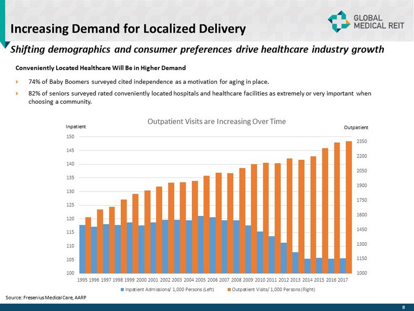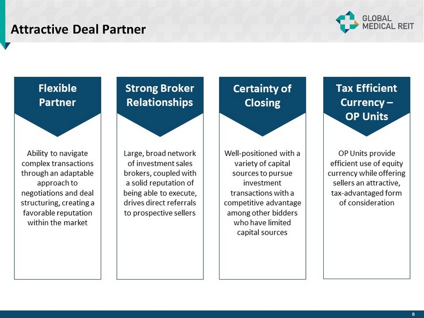 Targeted Approach To Acquisitions Focused on constructing a portfolio comprised substantially of off - campus, purpose - built, medical facilities such as MOBs, specialty hospitals, IRFs and ASCs, that are geographically situated to take advantage of the aging U.S. population and the decentralization of healthcare TENANTS MARKETS / LOCATIONS FACILITIES x Strong providers with leading market share x Specialization in age - related procedures x Operators with regional footprints x Strong and diversified payor mix x Institutional quality x Purpose - built real estate x Single tenant focus with selective multi - tenant acquisitions x Class A / Recent construction or renovation x Amenitized patient areas x Convenient access / location x Long - term leases with annual rent escalations x Healthcare market with clear and quantifiable competitive dynamics x Positioned to benefit from ongoing decentralization trends in healthcare x Proximity to related resources x Long - term positive demand drivers (population growth and demographics) x Barriers to competition 7