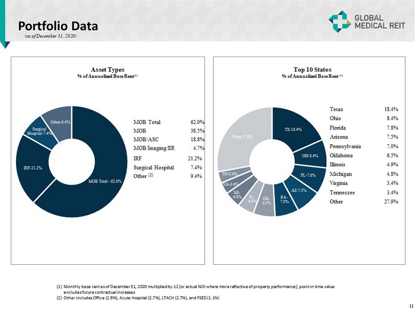 $94 $207 $472 $648 $906 $1,143 At IPO 2016 2017 2018 2019 2020 Strong Track Record of Acquisitions Since IPO Gross Investments In Real Estate ($ MM) From IPO through 2020, GMRE has grown the portfolio from $94 million to $1.1 billion of Gross Investments in Real Estate, or 74% annually. In 2020, GMRE completed 18 acquisitions totaling 915,241 SF for an aggregate purchase price of $226.5 million, producing ABR (1) of $17.7 million at a weighted average cap rate of 7.8% YTD in 2021, GMRE completed 4 acquisitions totaling 120,256 SF for an aggregate purchase price of $42.8 million, producing AB R (2) of $3.3 million at a weighted average cap rate of 7.6% The Company has a current pipeline under contract of 5 properties totaling 188,016 SF for an aggregate purchase price of $58. 3 m illion 10 0.7 Million SF 1.3 Million SF 2.1 Million SF 2.8 Million SF 3.7 Million SF 0.2 Million SF (1) Monthly base rent at December 31, 2020 multiplied by 12 (or actual NOI where more reflective of property performance); point in time value excludes future contractual increases (2) Monthly base rent at March 12, 2021 multiplied by 12 (or actual NOI for where more reflective of property performance); point in time value excludes future contractual increases