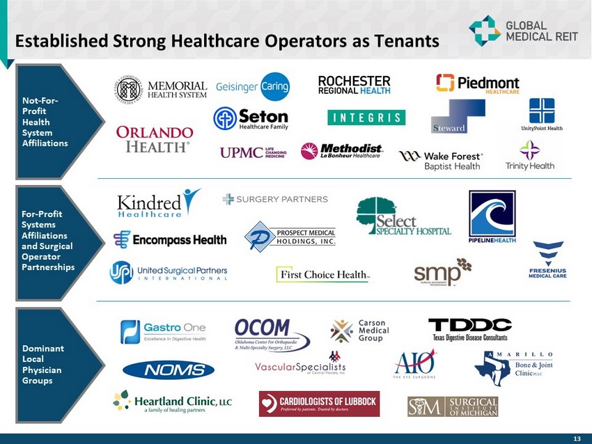 Established Strong Healthcare Operators as Tenants Not - For - Profit Health System Affiliations For - Profit Systems Affiliations and Surgical Operator Partnerships Dominant Local Physician Groups 13