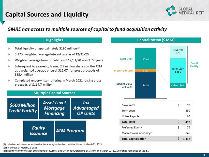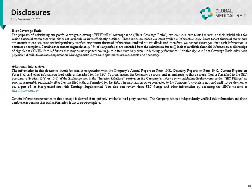 Disclosures Rent Coverage Ratio For purposes of calculating our portfolio weighted - average EBITDARM coverage ratio (“Rent Coverage Ratio”), we excluded credit - rated tenants or their subsidiaries for which financial statements were either not available or not sufficiently detailed . These ratios are based on latest available information only . Most tenant financial statements are unaudited and we have not independently verified any tenant financial information (audited or unaudited) and, therefore, we cannot assure you that such information is accurate or complete . Certain other tenants (approximately 7 % of our portfolio) are excluded from the calculation due to (i) lack of available financial information or (ii) receipt of significant COVID - 19 relief funds that may cause reported coverage to differ materially from underlying performance . Additionally, our Rent Coverage Ratio adds back physician distributions and compensation . Management believes all adjustments are reasonable and necessary . Additional Information The information in this document should be read in conjunction with the Company’s Annual Report on Form 10 - K, Quarterly Reports on Form 10 - Q, Current Reports on Form 8 - K, and other information filed with, or furnished to, the SEC . You can access the Company’s reports and amendments to those reports filed or furnished to the SEC pursuant to Section 13 (a) or 15 (d) of the Exchange Act in the “Investor Relations” section on the Company’s website (www . globalmedicalreit . com) under “SEC Filings” as soon as reasonably practicable after they are filed with, or furnished to, the SEC . The information on or connected to the Company’s website is not, and shall not be deemed to be, a part of, or incorporated into, this Earnings Supplemental . You also can review these SEC filings and other information by accessing the SEC’s website at http : //www . sec . gov . Certain information contained in this package is derived from publicly - available third - party sources . The Company has not independently verified this information and there can be no assurance that such information is accurate or complete . 18 (as of December 31, 2020)