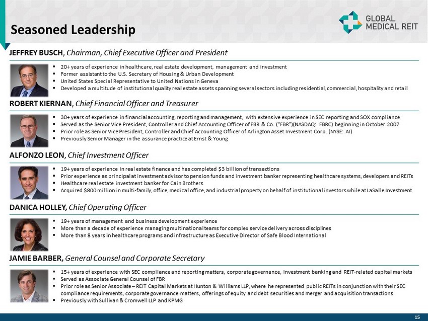 Seasoned Leadership JEFFREY BUSCH , Chairman, Chief Executive Officer and President ROBERT KIERNAN , Chief Financial Officer and Treasurer ALFONZO LEON , Chief Investment Officer ▪ 19 + years of experience in real estate finance and has completed $ 3 billion of transactions ▪ Prior experience as principal at investment advisor to pension funds and investment banker representing healthcare systems, d eve lopers and REITs ▪ Healthcare real estate investment banker for Cain Brothers ▪ Acquired $ 800 million in multi - family, office, medical office, and industrial property on behalf of institutional investors while at LaSalle Investment DANICA HOLLEY, Chief Operating Officer ▪ 19 + years of management and business development experience ▪ More than a decade of experience managing multinational teams for complex service delivery across disciplines ▪ More than 8 years in healthcare programs and infrastructure as Executive Director of Safe Blood International ▪ 15+ years of experience with SEC compliance and reporting matters, corporate governance, investment banking and REIT - related ca pital markets ▪ Served as Associate General Counsel of FBR ▪ Prior role as Senior Associate – REIT Capital Markets at Hunton & Williams LLP, where he represented public REITs in conjunction with their SEC compliance requirements, corporate governance matters, offerings of equity and debt securities and merger and acquisition tra nsa ctions ▪ Previously with Sullivan & Cromwell LLP and KPMG JAMIE BARBER, General Counsel and Corporate Secretary ▪ 20+ years of experience in healthcare, real estate development, management and investment ▪ Former assistant to the U.S. Secretary of Housing & Urban Development ▪ United States Special Representative to United Nations in Geneva ▪ Developed a multitude of institutional quality real estate assets spanning several sectors including residential, commercial, ho spitality and retail ▪ 30+ years of experience in financial accounting, reporting and management, with extensive experience in SEC reporting and SOX co mpliance ▪ Served as the Senior Vice President, Controller and Chief Accounting Officer of FBR & Co. (“FBR”)(NASDAQ: FBRC) beginning in Oct ober 2007 ▪ Prior role as Senior Vice President, Controller and Chief Accounting Officer of Arlington Asset Investment Corp. (NYSE: AI) ▪ Previously Senior Manager in the assurance practice at Ernst & Young 15