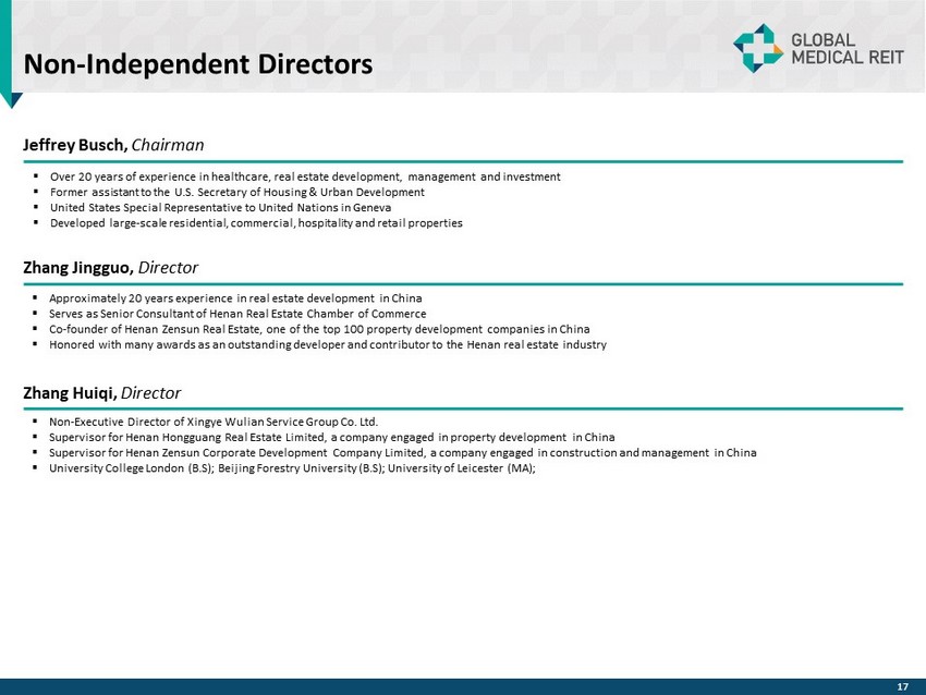 Independent Directors Majority independent Board with strong backgrounds in healthcare, real estate and capital markets Henry Cole ▪ President of Global Development International, providing development support and oversight for initiatives in medical and hea lth care programs (e.g. Instant Labs Medical Diagnostics, MedPharm & MPRC Group) ▪ Former President and Founder of international programs at The Futures Group International, a healthcare consulting firm ▪ Director of International Health and Population Programs for GE’s Center for Advanced Studies ▪ Yale (B.S.); Johns Hopkins (MA) Matthew Cypher, Ph.D. ▪ Director of the Steers Center for Global Real Estate and Atara Kaufman Professor of Real Estate at Georgetown University’s Mc Don ough School of Business ▪ Former director at Invesco Real Estate (NYSE: IVR) where he was responsible for oversight of the Underwriting Group, which ac qui red $10.2 billion worth of institutional real estate ▪ Underwrote $1.5 billion of acquisitions and oversaw the Valuations group, which marked to market Invesco’s more than $13 bill ion North American portfolio ▪ Penn State University (B.S.); Texas A&M University (M.S. and Ph.D.) Lori Wittman ▪ Served as the Chief Financial Officer for Care Capital Properties, Inc . (NYSE : CCP) (“Care Capital”), a publicly - traded REIT which was originally formed as a spin - off from Ventas, Inc . (NYSE : VTR) (“Ventas”) and owned over 340 healthcare properties nationwide and had an enterprise value of approximately $ 3 . 5 billion prior to its acquisition by Sabra Healthcare in August 2017 ▪ University of Chicago (M . B . A . , Finance & Accounting) ; University of Pennsylvania (M . C . P . , Housing & Real Estate Finance) Clark University (B . A . ) Ronald Marston ▪ Founder and CEO of Health Care Corporation of America (HCCA) Management Company, originally a subsidiary of Hospital Corporation of America (HCA) ▪ 30 + years in international healthcare focused on healthcare systems with prior experience developing the Twelfth Evacuation Hospital in Vietnam ▪ Tennessee Technological University (B . S . ) ; California Western University (Ph . D . ) ▪ Rear Admiral (Retired) and Chief Veterinary Medical Officer of United States Public Health Service ▪ Former Assistant United States Surgeon General, point person for global development support with a focus on less developed countries ▪ Epidemic Intelligence Service Officer with the U . S . Centers for Disease Control and Prevention (CDC) ▪ Chief epidemiologist with the Centers of Devices and Radiological Health in the US Food and Drug Administration (FDA) ▪ Tuskegee University (B . S . & DVM) ; University in Michigan (M . P . H . ) ; Johns Hopkins University (Ph . D . ) Dr. Roscoe Moore Paula Crowley ▪ Previously Chair Emeritus of Anchor Health Properties from November 2017 to April 2020, and Chairman of the Board from Octob er 2015 through November 2017 ▪ Co - founder and former CEO of Anchor Health Properties which was sold to Brinkman Management and Development in October 2015 ▪ Prior to Anchor, spent eight years as Development Director with The Rouse Company of Columbia, Maryland ▪ University of Pennsylvania (M.B.A., Masters in City Planning); Middlebury College (B.A.) 16