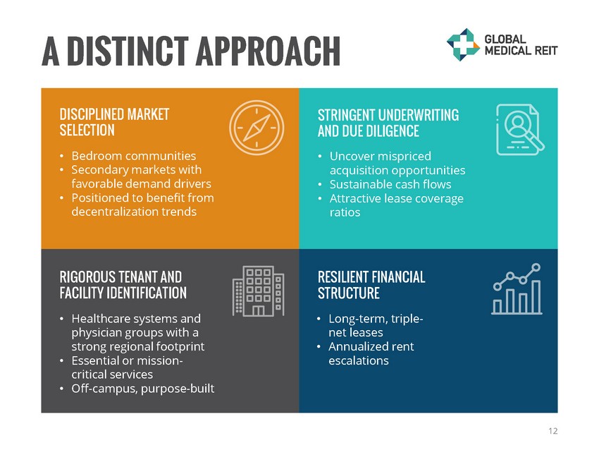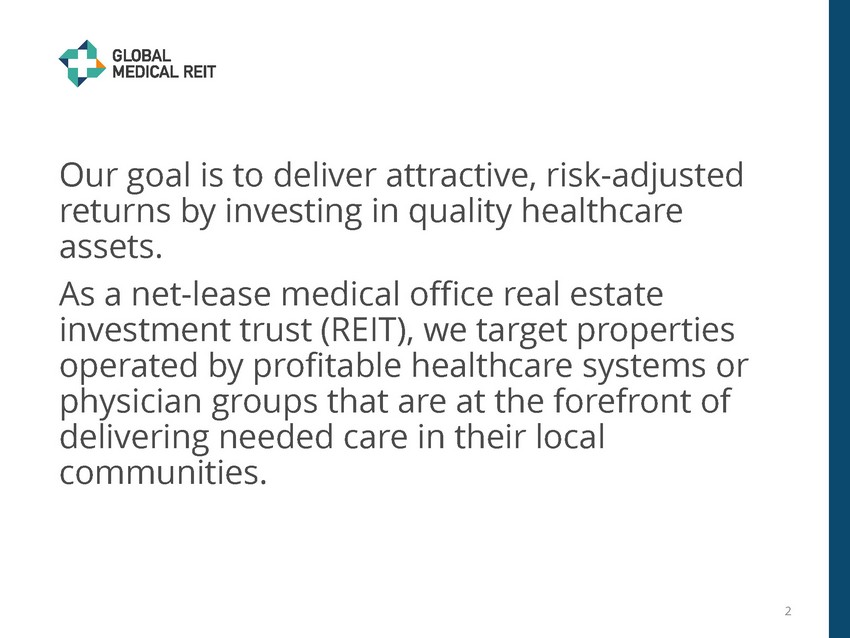 Our goal is to deliver attractive, risk - adjusted returns by investing in quality healthcare assets. As a net - lease medical office real estate investment trust (REIT), we target properties operated by profitable healthcare systems or physician groups that are at the forefront of delivering needed care in their local communities. 2