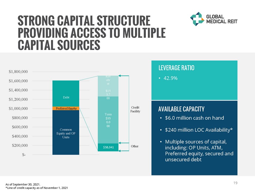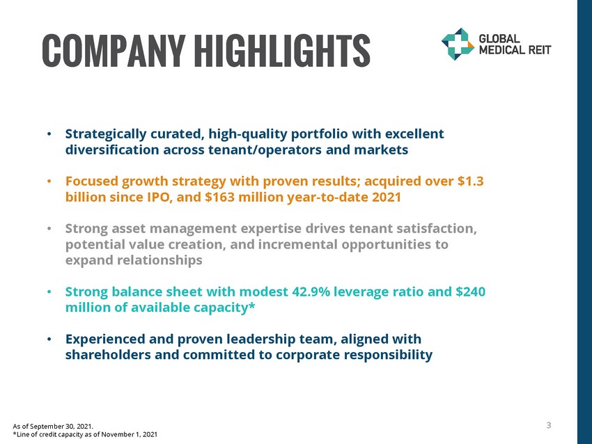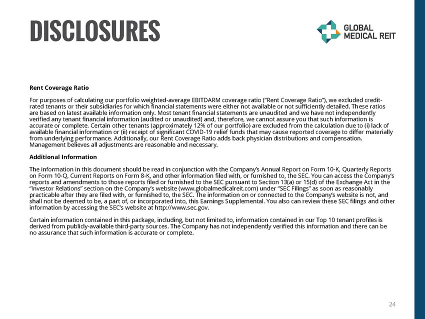 DISCLOSURES Rent Coverage Ratio For purposes of calculating our portfolio weighted - average EBITDARM coverage ratio (“Rent Coverage Ratio”), we excluded credit - rated tenants or their subsidiaries for which financial statements were either not available or not sufficiently detailed. These ratios are based on latest available information only. Most tenant financial statements are unaudited and we have not independently verified any tenant financial information (audited or unaudited) and, therefore, we cannot assure you that such information is accurate or complete. Certain other tenants (approximately 12% of our portfolio) are excluded from the calculation due to (i) lack of available financial information or (ii) receipt of significant COVID - 19 relief funds that may cause reported coverage to differ materially from underlying performance. Additionally, our Rent Coverage Ratio adds back physician distributions and compensation. Management believes all adjustments are reasonable and necessary. Additional Information The information in this document should be read in conjunction with the Company’s Annual Report on Form 10 - K, Quarterly Reports on Form 10 - Q, Current Reports on Form 8 - K, and other information filed with, or furnished to, the SEC. You can access the Company’s reports and amendments to those reports filed or furnished to the SEC pursuant to Section 13(a) or 15(d) of the Exchange Act in the “Investor Relations” section on the Company’s website (www.globalmedicalreit.com) under “SEC Filings” as soon as reasonably practicable after they are filed with, or furnished to, the SEC. The information on or connected to the Company’s website is not, and shall not be deemed to be, a part of, or incorporated into, this Earnings Supplemental. You also can review these SEC filings and other information by accessing the SEC’s website at http://www.sec.gov. Certain information contained in this package, including, but not limited to, information contained in our Top 10 tenant profiles is derived from publicly - available third - party sources. The Company has not independently verified this information and there can be no assurance that such information is accurate or complete. 24