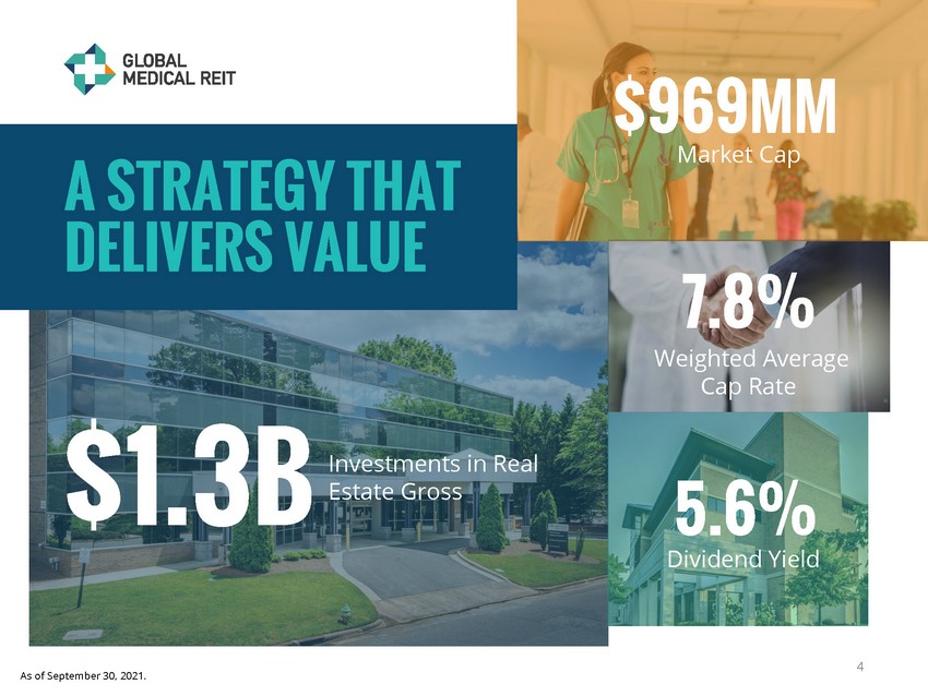 COMPANY HIGHLIGHTS 3 • Strategically curated, high - quality portfolio with excellent diversification across tenant/operators and markets • Focused growth strategy with proven results; acquired over $1.3 billion since IPO, and $163 million year - to - date 2021 • Strong asset management expertise drives tenant satisfaction, potential value creation, and incremental opportunities to expand relationships • Strong balance sheet with modest 42.9% leverage ratio and $240 million of available capacity* • Experienced and proven leadership team, aligned with shareholders and committed to corporate responsibility As of September 30, 2021. *Line of credit capacity as of November 1, 2021