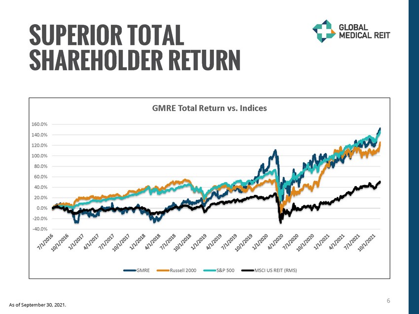 4 A STRATEGY THAT DELIVERS VALUE $1.3B Investments in Real Estate Gross $969MM Market Cap 7.8% Weighted Average Cap Rate 5.6% Dividend Yield As of September 30, 2021.