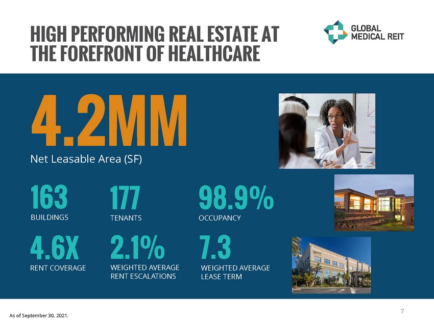 SUPERIOR TOTAL SHAREHOLDER RETURN 160.0% 140.0% 120.0% 100.0% 80.0% 60.0% 40.0% 20.0% 0.0% - 20.0% - 40.0% GMRE Total Return vs. Indices G MRE Russell 2000 S&P 500 MSCI US REIT (RMS) 6 As of September 30, 2021.