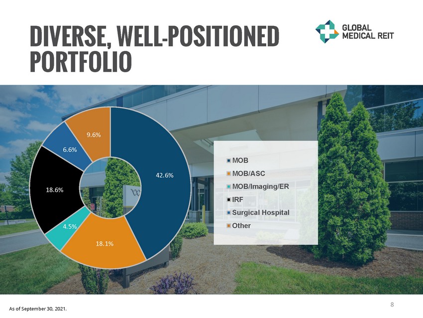 HIGH PERFORMING REAL ESTATE AT THE FOREFRONT OF HEALTHCARE 4.6X RENT COVERAGE WEIGHTED AVERAGE RENT ESCALATIONS 2.1 % 7.3 WEIGHTED AVERAGE LEASE TERM 163 BUILDI N GS 177 TEN A N TS 98.9% OCCUPANCY 4.2MM Net Leasable Area (SF) 7 As of September 30, 2021.