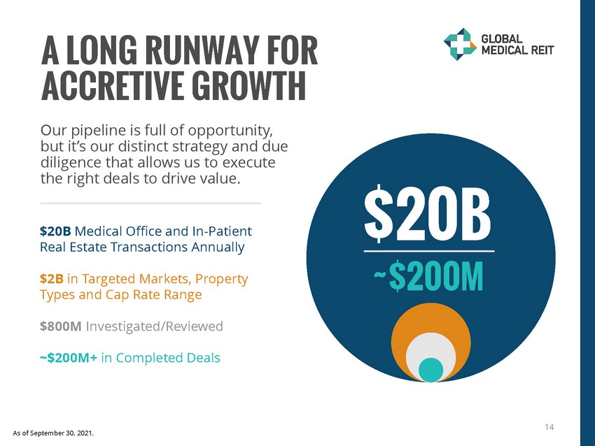 A LONG RUNWAY FOR ACCRETIVE GROWTH Our pipeline is full of opportunity, but it’s our distinct strategy and due diligence that allows us to execute the right deals to drive value. 14 $20B Medical Office and In - Patient Real Estate Transactions Annually $2B in Targeted Markets, Property Types and Cap Rate Range $800M Investigated/Reviewed ~$ 200M+ in Completed Deals $ 20B ~$200M As of September 30, 2021.