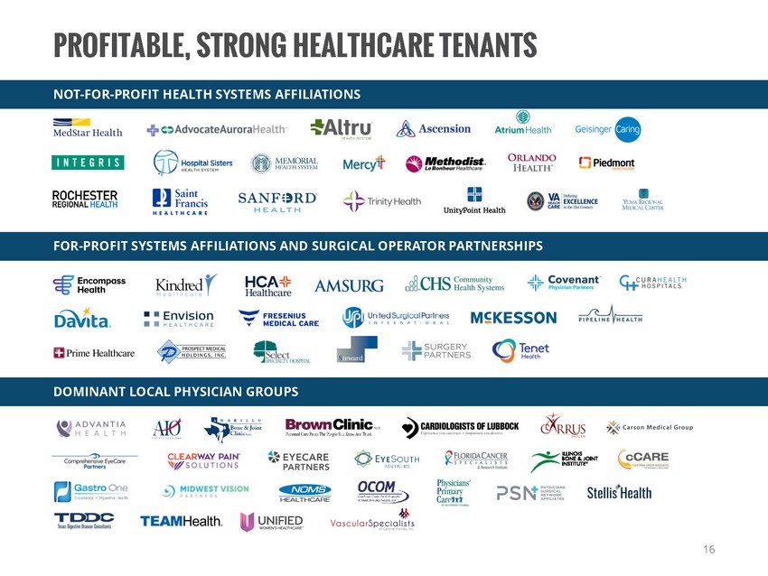 DOMINANT LOCAL PHYSICIAN GROUPS FOR - PROFIT SYSTEMS AFFILIATIONS AND SURGICAL OPERATOR PARTNERSHIPS PROFITABLE, STRONG HEALTHCARE TENANTS 16 NOT - FOR - PROFIT HEALTH SYSTEMS AFFILIATIONS