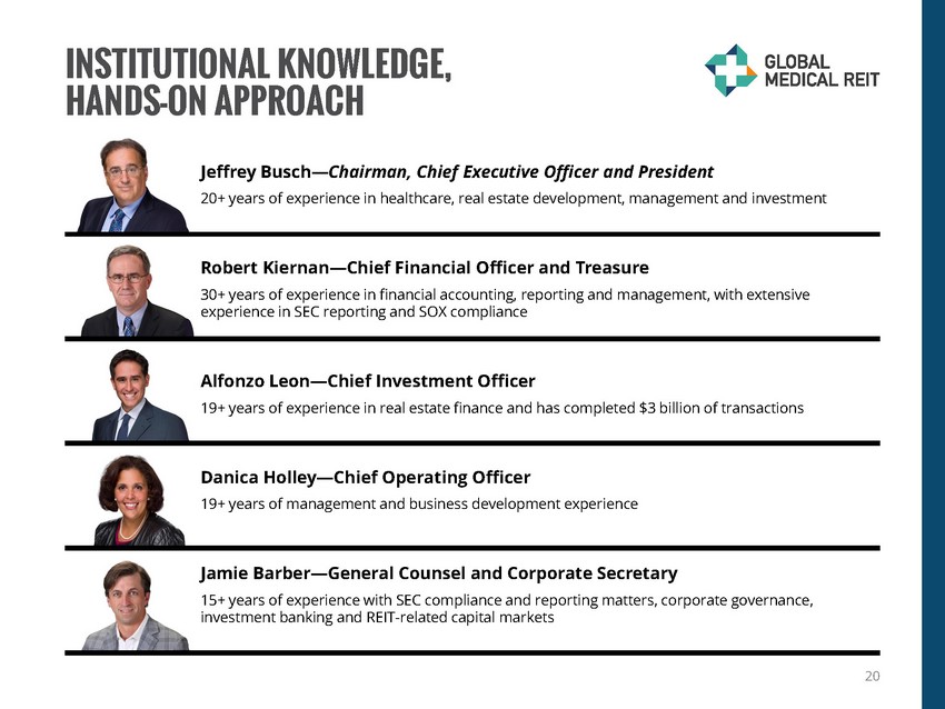INSTITUTIONAL KNOWLEDGE, HANDS - ON APPROACH Jeffrey Busch — Chairman, Chief Executive Officer and President 20+ years of experience in healthcare, real estate development, management and investment Robert Kiernan — Chief Financial Officer and Treasure 30+ years of experience in financial accounting, reporting and management, with extensive experience in SEC reporting and SOX compliance Alfonzo Leon — Chief Investment Officer 19+ years of experience in real estate finance and has completed $3 billion of transactions Danica Holley — Chief Operating Officer 19+ years of management and business development experience Jamie Barber — General Counsel and Corporate Secretary 15+ years of experience with SEC compliance and reporting matters, corporate governance, investment banking and REIT - related capital markets 20