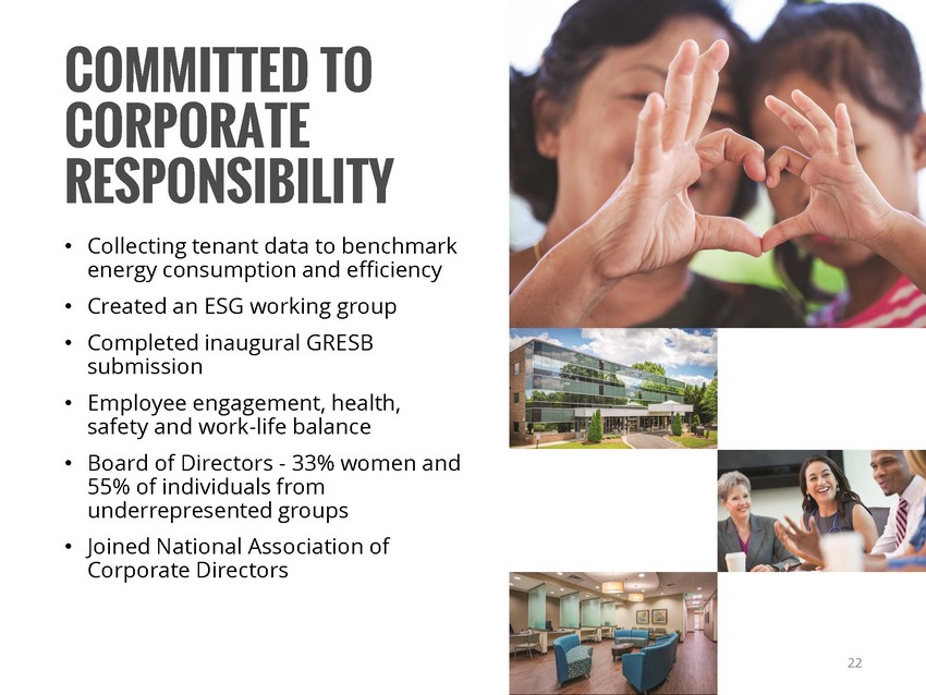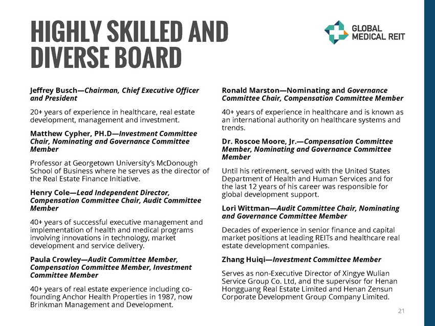HIGHLY SKILLED AND DIVERSE BOARD Jeffrey Busch — Chairman, Chief Executive Officer and President 20+ years of experience in healthcare, real estate development, management and investment. Matthew Cypher, PH.D — Investment Committee Chair, Nominating and Governance Committee Member Professor at Georgetown University’s McDonough School of Business where he serves as the director of the Real Estate Finance Initiative. Henry Cole — Lead Independent Director, Compensation Committee Chair, Audit Committee Member 40+ years of successful executive management and implementation of health and medical programs involving innovations in technology, market development and service delivery. Paula Crowley — Audit Committee Member, Compensation Committee Member, Investment Committee Member 40 + years of real estate experience including co - founding Anchor Health Properties in 1987 , now Brinkman Management and Development . Ronald Marston — Nominating and Governance Committee Chair, Compensation Committee Member 40+ years of experience in healthcare and is known as an international authority on healthcare systems and trends. Dr . Roscoe Moore, Jr . — Compensation Committee Member, Nominating and Governance Committee Member Until his retirement, served with the United States Department of Health and Human Services and for the last 12 years of his career was responsible for global development support. Lori Wittman — Audit Committee Chair, Nominating and Governance Committee Member Decades of experience in senior finance and capital market positions at leading REITs and healthcare real estate development companies. Zhang Huiqi — Investment Committee Member Serves as non - Executive Director of Xingye Wulian Service Group Co. Ltd, and the supervisor for Henan Hongguang Real Estate Limited and Henan Zensun Corporate Development Group Company Limited. 21