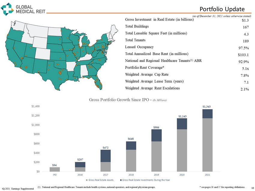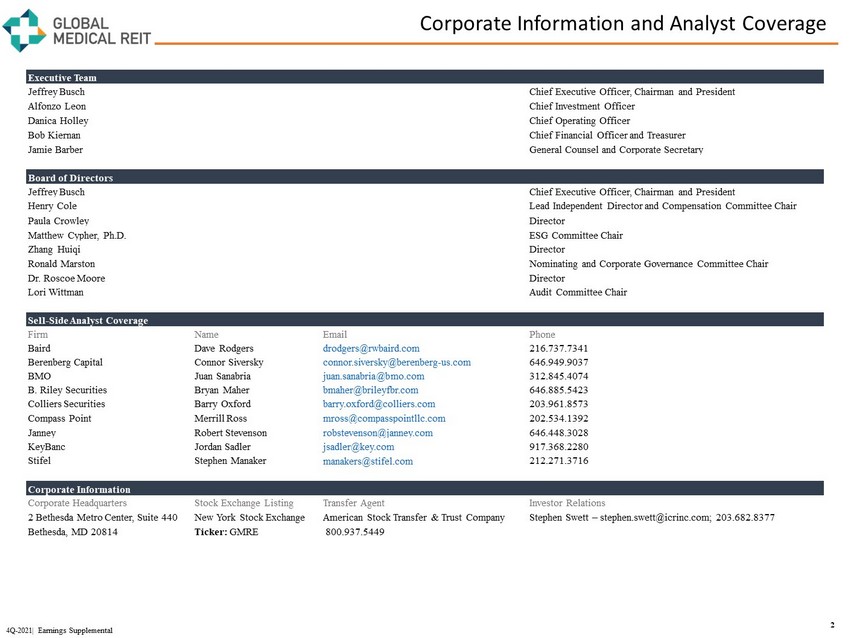Fourth Quarter 2021 Earnings Supplemental Three and Twelve Months Ended December 31, 2021 www.globalmedicalreit.com NYSE: GMRE