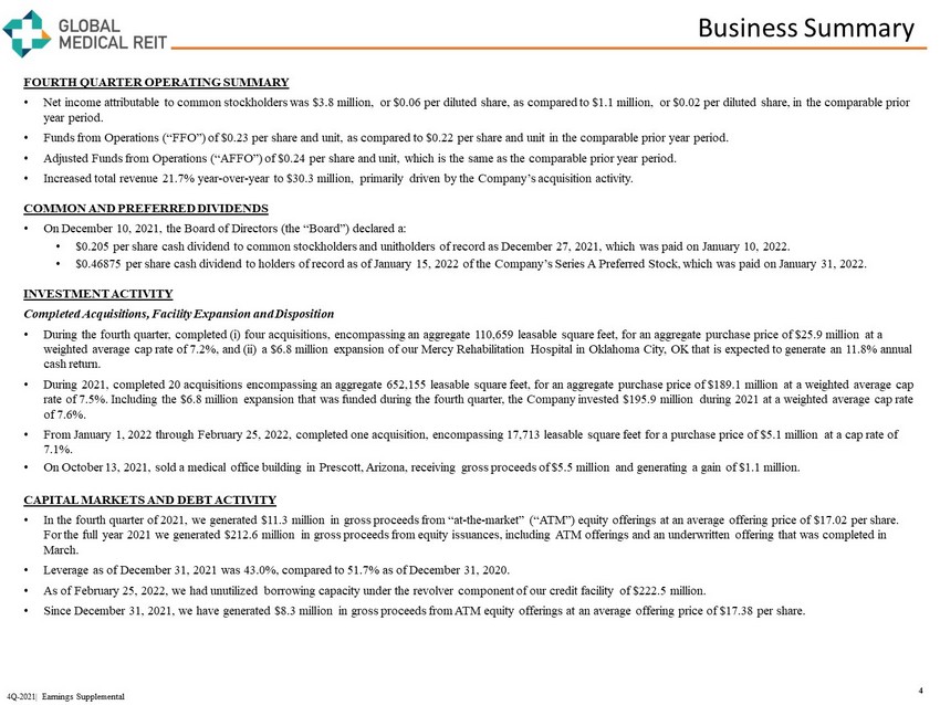 Business Summary 4 4Q - 2021| Earnings Supplemental FOURTH QUARTER OPERATING SUMMARY • Net income attributable to common stockholders was $3.8 million, or $0.06 per diluted share, as compared to $1.1 million, or $0. 02 per diluted share, in the comparable prior year period. • Funds from Operations (“FFO”) of $0.23 per share and unit, as compared to $0.22 per share and unit in the comparable prior ye ar period. • Adjusted Funds from Operations (“AFFO”) of $0.24 per share and unit, which is the same as the comparable prior year period. • Increased total revenue 21.7% year - over - year to $30.3 million, primarily driven by the Company’s acquisition activity. COMMON AND PREFERRED DIVIDENDS • On December 10, 2021, the Board of Directors (the “Board”) declared a: • $0.205 per share cash dividend to common stockholders and unitholders of record as December 27, 2021, which was paid on Janua ry 10, 2022. • $0.46875 per share cash dividend to holders of record as of January 15, 2022 of the Company’s Series A Preferred Stock, which wa s paid on January 31, 2022. INVESTMENT ACTIVITY Completed Acquisitions, Facility Expansion and Disposition • During the fourth quarter, completed (i) four acquisitions, encompassing an aggregate 110,659 leasable square feet, for an ag gre gate purchase price of $25.9 million at a weighted average cap rate of 7.2%, and (ii) a $6.8 million expansion of our Mercy Rehabilitation Hospital in Oklahoma City, O K t hat is expected to generate an 11.8% annual cash return. • During 2021, completed 20 acquisitions encompassing an aggregate 652,155 leasable square feet, for an aggregate purchase pric e o f $189.1 million at a weighted average cap rate of 7.5%. Including the $6.8 million expansion that was funded during the fourth quarter, the Company invested $195.9 mil lio n during 2021 at a weighted average cap rate of 7.6%. • From January 1, 2022 through February 25, 2022, completed one acquisition, encompassing 17,713 leasable square feet for a pur cha se price of $5.1 million at a cap rate of 7.1%. • On October 13, 2021, sold a medical office building in Prescott, Arizona, receiving gross proceeds of $5.5 million and genera tin g a gain of $1.1 million. CAPITAL MARKETS AND DEBT ACTIVITY • In the fourth quarter of 2021, we generated $11.3 million in gross proceeds from “at - the - market” (“ATM”) equity offerings at an average offering price of $17.02 per share. F or the full year 2021 we generated $212.6 million in gross proceeds from equity issuances, including ATM offerings and an und erw ritten offering that was completed in March. • Leverage as of December 31, 2021 was 43.0%, compared to 51.7% as of December 31, 2020. • As of February 25, 2022, we had unutilized borrowing capacity under the revolver component of our credit facility of $222.5 m ill ion. • Since December 31, 2021, we have generated $8.3 million in gross proceeds from ATM equity offerings at an average offering pr ice of $17.38 per share.