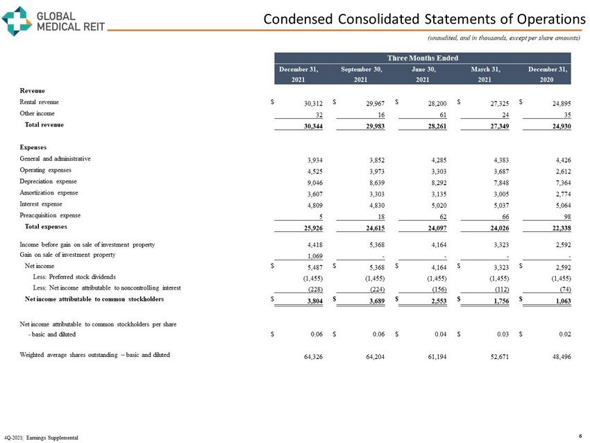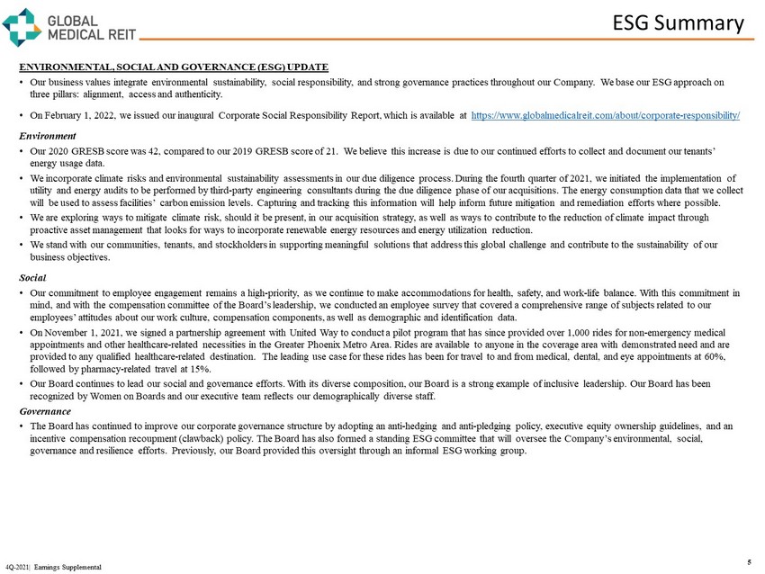 ESG Summary 5 4Q - 2021| Earnings Supplemental ENVIRONMENTAL, SOCIAL AND GOVERNANCE (ESG) UPDATE • Our business values integrate environmental sustainability, social responsibility, and strong governance practices throughout ou r Company. We base our ESG approach on three pillars: alignment, access and authenticity. • On February 1, 2022, we issued our inaugural Corporate Social Responsibility Report, which is available at https://www.globalmedicalreit.com/about/corporate - responsibility/ Environment • Our 2020 GRESB score was 42, compared to our 2019 GRESB score of 21. We believe this increase is due to our continued effort s t o collect and document our tenants’ energy usage data. • We incorporate climate risks and environmental sustainability assessments in our due diligence process. During the fourth quarter of 2021, we initiated the implementation of utility and energy audits to be performed by third - party engineering consultants during the due diligence phase of our acquisiti ons. The energy consumption data that we collect will be used to assess facilities’ carbon emission levels. Capturing and tracking this information will help inform future mi tig ation and remediation efforts where possible. • We are exploring ways to mitigate climate risk, should it be present, in our acquisition strategy, as well as ways to contrib ute to the reduction of climate impact through proactive asset management that looks for ways to incorporate renewable energy resources and energy utilization reduction. • We stand with our communities, tenants, and stockholders in supporting meaningful solutions that address this global challeng e a nd contribute to the sustainability of our business objectives. Social • Our commitment to employee engagement remains a high - priority, as we continue to make accommodations for health, safety, and wor k - life balance. With this commitment in mind, and with the compensation committee of the Board’s leadership, we conducted an employee survey that covered a comprehen siv e range of subjects related to our employees’ attitudes about our work culture, compensation components, as well as demographic and identification data. • On November 1, 2021, we signed a partnership agreement with United Way to conduct a pilot program that has since provided ove r 1 ,000 rides for non - emergency medical appointments and other healthcare - related necessities in the Greater Phoenix Metro Area. Rides are available to anyone in the co verage area with demonstrated need and are provided to any qualified healthcare - related destination. The leading use case for these rides has been for travel to and from medical, dental, and eye appointments at 60%, followed by pharmacy - related travel at 15%. • Our Board continues to lead our social and governance efforts. With its diverse composition, our Board is a strong example of inc lus ive leadership. Our Board has been recognized by Women on Boards and our executive team reflects our demographically diverse staff. Governance • The Board has continued to improve our corporate governance structure by adopting an anti - hedging and anti - pledging policy, exec utive equity ownership guidelines, and an incentive compensation recoupment ( clawback ) policy. The Board has also formed a standing ESG committee that will oversee the Company’s environmental, social, governance and resilience efforts. Previously, our Board provided this oversight through an informal ESG working group.