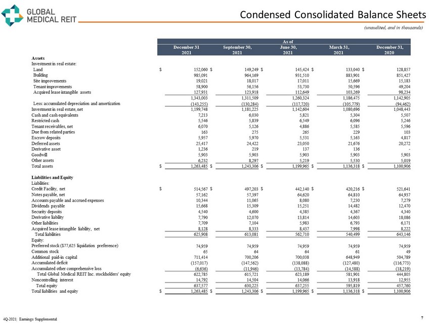 Condensed Consolidated Statements of Operations 6 4Q - 2021| Earnings Supplemental (unaudited, and in thousands, except per share amounts) Three Months Ended December 31, September 30, June 30, March 31, December 31, 2021 2021 2021 2021 2020 Revenue Rental revenue $ 30,312 $ 29,967 $ 28,200 $ 27,325 $ 24,895 Other income 32 16 61 24 35 Total revenue 30,344 29,983 28,261 27,349 24,930 Expenses General and administrative 3,934 3,852 4,285 4,383 4,426 Operating expenses 4,525 3,973 3,303 3,687 2,612 Depreciation expense 9,046 8,639 8,292 7,848 7,364 Amortization expense 3,607 3,303 3,135 3,005 2,774 Interest expense 4,809 4,830 5,020 5,037 5,064 Preacquisition expense 5 18 62 66 98 Total expenses 25,926 24,615 24,097 24,026 22,338 Income before gain on sale of investment property 4,418 5,368 4,164 3,323 2,592 Gain on sale of investment property 1,069 - - - - Net income $ 5,487 $ 5,368 $ 4,164 $ 3,323 $ 2,592 Less: Preferred stock dividends (1,455) (1,455) (1,455) (1,455) (1,455) Less: Net income attributable to noncontrolling interest (228) (224) (156) (112) (74) Net income attributable to common stockholders $ 3,804 $ 3,689 $ 2,553 $ 1,756 $ 1,063 Net income attributable to common stockholders per share - basic and diluted $ 0.06 $ 0.06 $ 0.04 $ 0.03 $ 0.02 Weighted average shares outstanding – basic and diluted 64,326 64,204 61,194 52,671 48,496