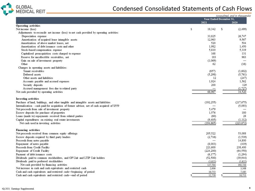Condensed Consolidated Balance Sheets 7 4Q - 2021| Earnings Supplemental (unaudited, and in thousands) As of December 31 September 30, June 30, March 31, December 31, 2021 2021 2021 2021 2020 Assets Investment in real estate: Land $ 152,060 $ 149,249 $ 145,424 $ 133,040 $ 128,857 Building 985,091 964,169 931,510 883,901 851,427 Site improvements 19,021 18,017 17,011 15,669 15,183 Tenant improvements 58,900 56,156 53,730 50,596 49,204 Acquired lease intangible assets 127,931 123,918 112,649 103,269 98,234 1,343,003 1,311,509 1,260,324 1,186,475 1,142,905 Less: accumulated depreciation and amortization (143,255) (130,284) (117,720) (105,779) (94,462) Investment in real estate, net 1,199,748 1,181,225 1,142,604 1,080,696 1,048,443 Cash and cash equivalents 7,213 6,030 5,821 5,304 5,507 Restricted cash 5,546 5,839 6,549 6,096 5,246 Tenant receivables, net 6,070 5,126 4,886 5,585 5,596 Due from related parties 163 275 265 229 103 Escrow deposits 5,957 5,970 5,531 5,163 4,817 Deferred assets 25,417 24,422 23,050 21,676 20,272 Derivative asset 1,236 219 137 136 - Goodwill 5,903 5,903 5,903 5,903 5,903 Other assets 6,232 8,297 5,219 5,530 5,019 Total assets $ 1,263,485 $ 1,243,306 $ 1,199,965 $ 1,136,318 $ 1,100,906 Liabilities and Equity Liabilities: Credit Facility, net $ 514,567 $ 497,203 $ 442,140 $ 420,216 $ 521,641 Notes payable, net 57,162 57,397 64,620 64,810 64,937 Accounts payable and accrued expenses 10,344 11,065 8,080 7,230 7,279 Dividends payable 15,668 15,309 15,251 14,482 12,470 Security deposits 4,540 4,600 4,385 4,367 4,340 Derivative liability 7,790 12,070 13,814 14,603 18,086 Other liabilities 7,709 7,104 5,983 6,793 6,171 Acquired lease intangible liability, net 8,128 8,333 8,437 7,998 8,222 Total liabilities 625,908 613,081 562,710 540,499 643,146 Equity: Preferred stock ($77,625 liquidation preference) 74,959 74,959 74,959 74,959 74,959 Common stock 65 64 64 61 49 Additional paid - in capital 711,414 700,206 700,038 648,949 504,789 Accumulated deficit (157,017) (147,562) (138,088) (127,480) (116,773) Accumulated other comprehensive loss (6,636) (11,946) (13,784) (14,588) (18,219) Total Global Medical REIT Inc. stockholders' equity 622,785 615,721 623,189 581,901 444,805 Noncontrolling interest 14,792 14,504 14,066 13,918 12,955 Total equity 637,577 630,225 637,255 595,819 457,760 Total liabilities and equity $ 1,263,485 $ 1,243,306 $ 1,199,965 $ 1,136,318 $ 1,100,906