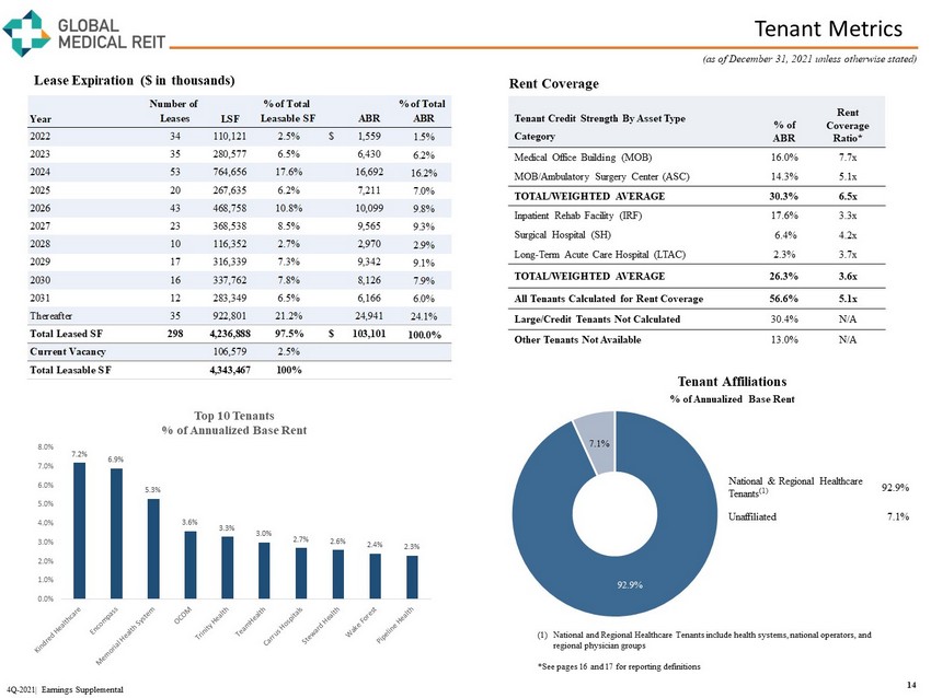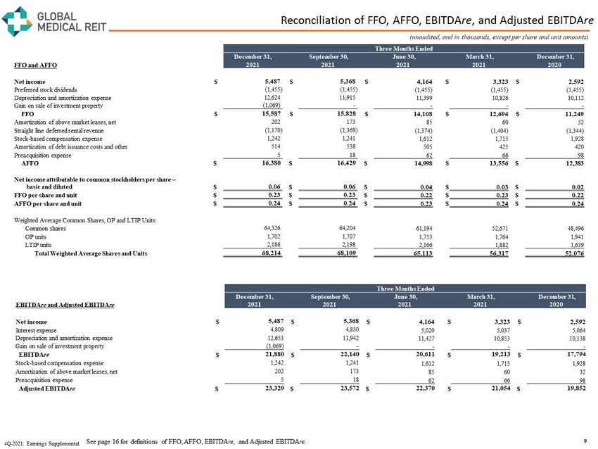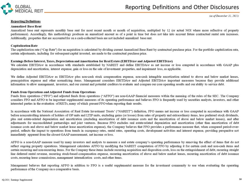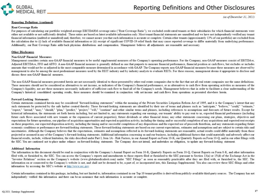 Reporting Definitions and Other Disclosures Reporting Definitions (continued) Rent Coverage Ratio For purposes of calculating our portfolio weighted - average EBITDARM coverage ratio (“Rent Coverage Ratio”), we excluded credit - rated tenants or their subsidiaries for which financial statements were either not available or not sufficiently detailed . These ratios are based on latest available information only . Most tenant financial statements are unaudited and we have not independently verified any tenant financial information (audited or unaudited) and, therefore, we cannot assure you that such information is accurate or complete . Certain other tenants (approximately 13 % of our portfolio) are excluded from the calculation due to (i) lack of available financial information or (ii) receipt of significant COVID - 19 relief funds that may cause reported coverage to differ materially from underlying performance . Additionally, our Rent Coverage Ratio adds back physician distributions and compensation . Management believes all adjustments are reasonable and necessary . Other Disclosures Non - GAAP Financial Measures Management considers certain non - GAAP financial measures to be useful supplemental measures of the Company's operating performance . For the Company, non - GAAP measures consist of EBITDA re , Adjusted EBITDA re , FFO and AFFO . A non - GAAP financial measure is generally defined as one that purports to measure financial performance, financial position or cash flows, but excludes or includes amounts that would not be so adjusted in the most comparable measure determined in accordance with GAAP . The Company reports non - GAAP financial measures because these measures are observed by management to also be among the most predominant measures used by the REIT industry and by industry analysts to evaluate REITs . For these reasons, management deems it appropriate to disclose and discuss these non - GAAP financial measures . The non - GAAP financial measures presented herein are not necessarily identical to those presented by other real estate companies due to the fact that not all real estate companies use the same definitions . These measures should not be considered as alternatives to net income, as indicators of the Company's financial performance, or as alternatives to cash flow from operating activities as measures of the Company's liquidity, nor are these measures necessarily indicative of sufficient cash flow to fund all of the Company's needs . Management believes that in order to facilitate a clear understanding of the Company's historical consolidated operating results, these measures should be examined in conjunction with net income and cash flows from operations as presented elsewhere herein . Forward - Looking Statements Certain statements contained herein may be considered “forward - looking statements” within the meaning of the Private Securities Litigation Reform Act of 1995 , and it is the Company’s intent that any such statements be protected by the safe harbor created thereby . These forward - looking statements are identified by their use of terms and phrases such as "anticipate," "believe," "could," "estimate," "expect," "intend," "may," "should," "plan," "predict," "project," "will," "continue" and other similar terms and phrases, including references to assumptions and forecasts of future results . Except for historical information, the statements set forth herein including, but not limited to, any statements regarding our earnings, our tenants’ ability to pay rent to us, expected financial performance (including future cash flows associated with new tenants or the expansion of current properties), future dividends or other financial items ; any other statements concerning our plans, strategies, objectives and expectations for future operations, our pipeline of acquisition opportunities and expected acquisition activity, including the timing and/or successful completion of any acquisitions and expected rent receipts on these properties, our expected disposition activity, including the timing and/or successful completion of any dispositions and the expected use of proceeds therefrom, and any statements regarding future economic conditions or performance are forward - looking statements . These forward - looking statements are based on our current expectations, estimates and assumptions and are subject to certain risks and uncertainties . Although the Company believes that the expectations, estimates and assumptions reflected in its forward - looking statements are reasonable, actual results could differ materially from those projected or assumed in any of the Company’s forward - looking statements . Additional information concerning us and our business, including additional factors that could materially and adversely affect our financial results, include, without limitation, the risks described under Part I, Item 1 A - Risk Factors, in our Annual Report on Form 10 - K, our Quarterly Reports on Form 10 - Q, and in our other filings with the SEC . You are cautioned not to place undue reliance on forward - looking statements . The Company does not intend, and undertakes no obligation, to update any forward - looking statement . Additional Information The information in this document should be read in conjunction with the Company’s Annual Report on Form 10 - K, Quarterly Reports on Form 10 - Q, Current Reports on Form 8 - K, and other information filed with, or furnished to, the SEC . You can access the Company’s reports and amendments to those reports filed or furnished to the SEC pursuant to Section 13 (a) or 15 (d) of the Exchange Act in the “Investor Relations” section on the Company’s website (www . globalmedicalreit . com) under “SEC Filings” as soon as reasonably practicable after they are filed with, or furnished to, the SEC . The information on or connected to the Company’s website is not, and shall not be deemed to be, a p