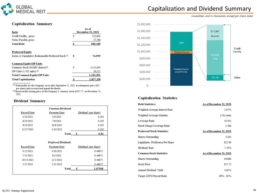 Reconciliation of FFO, AFFO, EBITDA re , and Adjusted EBITDA re 9 4Q - 2021| Earnings Supplemental (unaudited, and in thousands, except per share and unit amounts) Three Months Ended December 31, September 30, June 30, March 31, December 31, FFO and AFFO 2021 2021 2021 2021 2020 Net income $ 5,487 $ 5,368 $ 4,164 $ 3,323 $ 2,592 Preferred stock dividends (1,455) (1,455) (1,455) (1,455) (1,455) Depreciation and amortization expense 12,624 11,915 11,399 10,826 10,112 Gain on sale of investment property (1,069) - - - - FFO $ 15,587 $ 15,828 $ 14,108 $ 12,694 $ 11,249 Amortization of above market leases, net 202 173 85 60 32 Straight line deferred rental revenue (1,170) (1,369) (1,374) (1,404) (1,344) Stock - based compensation expense 1,242 1,241 1,612 1,715 1,928 Amortization of debt issuance costs and other 514 538 505 425 420 Preacquisition expense 5 18 62 66 98 AFFO $ 16,380 $ 16,429 $ 14,998 $ 13,556 $ 12,383 Net income attributable to common stockholders per share – basic and diluted $ 0.06 $ 0.06 $ 0.04 $ 0.03 $ 0.02 FFO per share and unit $ 0.23 $ 0.23 $ 0.22 $ 0.23 $ 0.22 AFFO per share and unit $ 0.24 $ 0.24 $ 0.23 $ 0.24 $ 0.24 Weighted Average Common Shares, OP and LTIP Units: Common shares 64,326 64,204 61,194 52,671 48,496 OP units 1,702 1,707 1,753 1,764 1,941 LTIP units 2,186 2,198 2,166 1,882 1,639 Total Weighted Average Shares and Units 68,214 68,109 65,113 56,317 52,076 Three Months Ended December 31, September 30, June 30, March 31, December 31, EBITDA re and Adjusted EBITDA re 2021 2021 2021 2021 2020 Net income $ 5,487 $ 5,368 $ 4,164 $ 3,323 $ 2,592 Interest expense 4,809 4,830 5,020 5,037 5,064 Depreciation and amortization expense 12,653 11,942 11,427 10,853 10,138 Gain on sale of investment property (1,069) - - - - EBITDA re $ 21,880 $ 22,140 $ 20,611 $ 19,213 $ 17,794 Stock - based compensation expense 1,242 1,241 1,612 1,715 1,928 Amortization of above market leases, net 202 173 85 60 32 Preacquisition expense 5 18 62 66 98 Adjusted EBITDA re $ 23,329 $ 23,572 $ 22,370 $ 21,054 $ 19,852 See page 16 for definitions of FFO, AFFO, EBITDA re , and Adjusted EBITDA re .