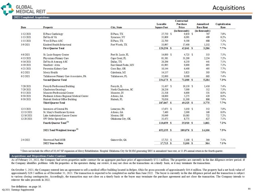 Contractual Leasable Purchase Annualized Capitalization Date Property City, State Square Feet Price Base Rent Rate (in thousands) (in thousands) 1/12/2021 El Paso Cardiology El Paso, TX 27,750 $ 9,850 $ 767 7.8% 1/15/2021 DaVita & VA Syracuse, NY 35,809 6,091 499 8.2% 1/15/2021 West El Paso ASC El Paso, TX 22,700 9,500 688 7.2% 3/9/2021 Kindred Health Behavioral Fort Worth, TX 33,997 17,400 1,332 7.7% First Quarter Total 120,256 $ 42,841 $ 3,286 7.7% 4/6/2021 St. Lucie Surgery Center Port St. Lucie, FL 14,000 $ 4,725 $ 353 7.5% 4/13/2021 Physicians Primary Care Cape Coral, FL 81,581 31,200 2,234 7.2% 4/16/2021 DaVita & Amsurg ASC Dallas, TX 20,296 6,250 441 7.1% 4/19/2021 Stanford / Altru East Grand Forks, MN 61,995 9,600 695 7.2% 4/21/2021 Fresenius Kidney Care Coos Bay, OR 10,144 6,400 495 7.7% 6/2/2021 Mercy Health Caledonia, MI 14,157 3,825 303 7.9% 6/2/2021 Tallahassee Primary Care Associates, PA Tallahassee, FL 32,000 9,000 663 7.4% Second Quarter Total 234,173 $ 71,000 $ 5,184 7.3% 7/28/2021 Forsyth Professional Building Forsyth, IL 51,437 $ 19,150 $ 1,416 7.4% 7/29/2021 Charleston Oncology North Charleston, SC 26,256 7,000 512 7.3% 9/15/2021 Munster Professional Center Munster, IN 21,318 6,600 531 8.0% 9/30/2021 Piedmont Athens Regional Medical Center Athens, GA 18,000 5,275 420 8.0% 9/30/2021 Hialeah Medical Office Building Hialeah, FL 70,056 11,300 896 7.9% Third Quarter Total 187,067 $ 49,325 $ 3,775 7.7% 12/3/2021 Internists of Central PA Lemoyne, PA 17,675 $ 5,050 $ 352 7.0% 12/13/2021 St. Mary's Healthcare System Athens, GA 7,460 2,000 160 8.0% 12/16/2021 Lake Ambulatory Cancer Center Mentor, OH 50,049 10,085 722 7.2% 12/20/2021 SW Ortho Specialists Oklahoma City, OK 35,475 8,775 627 7.1% Fourth Quarter Total (1) 110,659 $ 25,910 $ 1,861 7.2% 2021 Total/Weighted Average (1) 652,155 $ 189,076 $ 14,106 7.5% 2/4/2022 Sherwood Park MOB Gainesville, GA 17,713 $ 5,100 $ 364 7.1% 2022 Year-to-Date 17,713 $ 5,100 $ 364 7.1% Acquisitions 11 2021 Completed Acquisitions Acquisitions and Dispositions Under Contract As of February 25 , 2022 , the Company had seven properties under contract for an aggregate purchase price of approximately $ 72 . 1 million . The properties are currently in the due diligence review period . If the Company identifies problems with the properties or the operators during our review, it may not close on the transactions on a timely basis, or it may terminate the transactions . On October 5 , 2021 , the Company entered into an agreement to sell a medical office building located in Belpre, Ohio for gross proceeds of approximately $ 44 . 6 million . The property had a net book value of approximately $ 29 . 5 million as of December 31 , 2021 . The transaction is expected to be completed no earlier than June 2022 . The buyer is currently in the due diligence period and the transaction is subject to various closing contingencies . Accordingly, the transaction may not close on a timely basis or the buyer may terminate the purchase agreement and not close the transaction . The Company intends to reinvest the sales proceeds in 2022 . See definitions on page 16 . 4Q - 2021| Earnings Supplemental 1) Does not include the effect of 10,447 SF expansion at Mercy Rehabilitation Hospital Oklahoma City for $6.8M generating $805 i n annualized base rent, or 11.8% annual return in the fourth quarter.