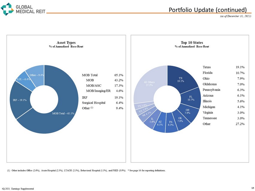 Portfolio Update 12 Gross Investment in Real Estate (in billions) $1.3 Total Buildings 167 Total Leasable Square Feet (in millions) 4.3 Total Tenants 189 Leased Occupancy 97.5% Total Annualized Base Rent (in millions) $103.1 National and Regional Healthcare Tenants (1) ABR 92.9% Portfolio Rent Coverage* 5.1x Weighted Average Cap Rate 7.8% Weighted Average Lease Term (years) 7.1 Weighted Average Rent Escalations 2.1% (as of December 31, 2021 unless otherwise stated) 4Q - 2021| Earnings Supplemental (1) National and Regional Healthcare Tenants include health systems, national operators, and regional physician groups. * see pages 16 and 17 for reporting definitions. $94 $207 $472 $648 $906 $1,143 $1,343 $0 $200 $400 $600 $800 $1,000 $1,200 $1,400 IPO 2016 2017 2018 2019 2020 2021 Gross Portfolio Growth Since IPO - (In Millions) Gross Real Estate Assets Gross Real Estate Investments During the Year
