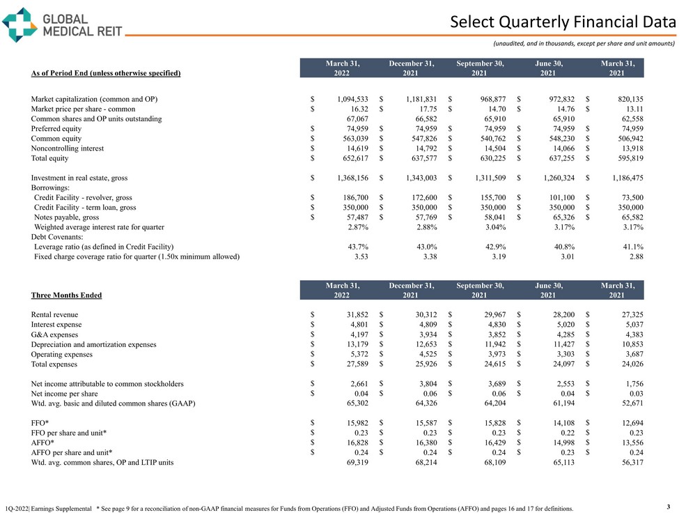 Corporate Information and Analyst Coverage 2 1Q - 2022| Earnings Supplemental Executive Team Jeffrey Busch Chief Executive Officer, Chairman and President Alfonzo Leon Chief Investment Officer Danica Holley Chief Operating Officer Bob Kiernan Chief Financial Officer and Treasurer Jamie Barber General Counsel and Corporate Secretary Board of Directors Jeffrey Busch Chief Executive Officer, Chairman and President Henry Cole Lead Independent Director and Compensation Committee Chair Paula Crowley Director Matthew Cypher, Ph.D. ESG Committee Chair Zhang Huiqi Director Ronald Marston Nominating and Corporate Governance Committee Chair Dr. Roscoe Moore Director Lori Wittman Audit Committee Chair Sell - Side Analyst Coverage Firm Name Email Phone Baird Dave Rodgers drodgers@rwbaird.com 216.737.7341 Berenberg Capital Connor Siversky connor.siversky@berenberg - us.com 646.949.9037 BMO Juan Sanabria juan.sanabria@bmo.com 312.845.4074 B. Riley Securities Bryan Maher bmaher@brileyfbr.com 646.885.5423 Colliers Securities Barry Oxford barry.oxford@colliers.com 203.961.8573 Compass Point Merrill Ross mross@compasspointllc.com 202.534.1392 Janney Robert Stevenson robstevenson@janney.com 646.448.3028 KeyBanc Todd Thomas tthomas@key.com 917.368.2286 Stifel Stephen Manaker manakers@stifel.com 212.271.3716 Corporate Information Corporate Headquarters Stock Exchange Listing Transfer Agent Investor Relations 2 Bethesda Metro Center, Suite 440 New York Stock Exchange American Stock Transfer & Trust Company Stephen Swett – stephen.swett@icrinc.com; 203.682.8377 Bethesda, MD 20814 Ticker: GMRE 800.937.5449