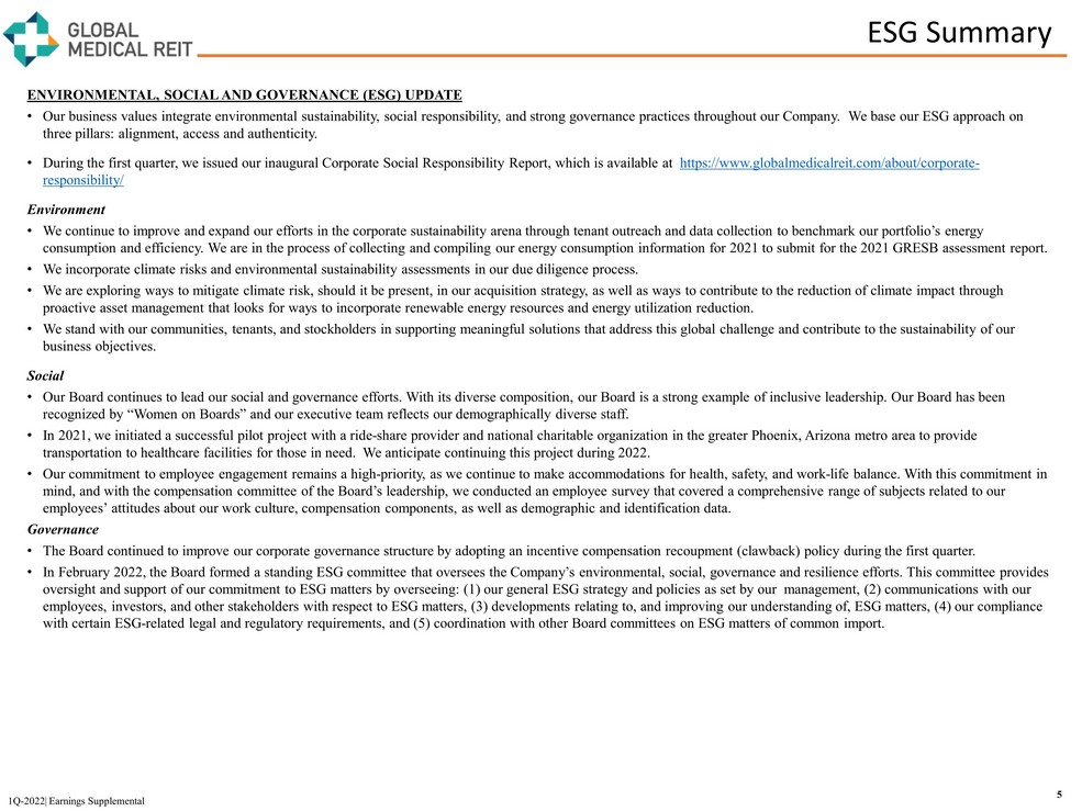 ESG Summary 5 1Q - 2022| Earnings Supplemental ENVIRONMENTAL, SOCIAL AND GOVERNANCE (ESG) UPDATE • Our business values integrate environmental sustainability, social responsibility, and strong governance practices throughout ou r Company. We base our ESG approach on three pillars: alignment, access and authenticity. • During the first quarter, we issued our inaugural Corporate Social Responsibility Report, which is available at https://www.globalmedicalreit.com/about/corporate - responsibility/ Environment • We continue to improve and expand our efforts in the corporate sustainability arena through tenant outreach and data collecti on to benchmark our portfolio’s energy consumption and efficiency. We are in the process of collecting and compiling our energy consumption information for 2021 to sub mit for the 2021 GRESB assessment report. • We incorporate climate risks and environmental sustainability assessments in our due diligence process. • We are exploring ways to mitigate climate risk, should it be present, in our acquisition strategy, as well as ways to contrib ute to the reduction of climate impact through proactive asset management that looks for ways to incorporate renewable energy resources and energy utilization reduction. • We stand with our communities, tenants, and stockholders in supporting meaningful solutions that address this global challeng e a nd contribute to the sustainability of our business objectives. Social • Our Board continues to lead our social and governance efforts. With its diverse composition, our Board is a strong example of inc lus ive leadership. Our Board has been recognized by “Women on Boards” and our executive team reflects our demographically diverse staff. • In 2021, we initiated a successful pilot project with a ride - share provider and national charitable organization in the greater Phoenix, Arizona metro area to provide transportation to healthcare facilities for those in need. We anticipate continuing this project during 2022. • Our commitment to employee engagement remains a high - priority, as we continue to make accommodations for health, safety, and wor k - life balance. With this commitment in mind, and with the compensation committee of the Board’s leadership, we conducted an employee survey that covered a comprehen siv e range of subjects related to our employees’ attitudes about our work culture, compensation components, as well as demographic and identification data. Governance • The Board continued to improve our corporate governance structure by adopting an incentive compensation recoupment ( clawback ) policy during the first quarter. • In February 2022, the Board formed a standing ESG committee that oversees the Company’s environmental, social, governance and resilience efforts. This committee provides oversight and support of our commitment to ESG matters by overseeing: (1) our general ESG strategy and policies as set by our m anagement, (2) communications with our employees, investors, and other stakeholders with respect to ESG matters, (3) developments relating to, and improving our und ers tanding of, ESG matters, (4) our compliance with certain ESG - related legal and regulatory requirements, and (5) coordination with other Board committees on ESG matters of c ommon import.