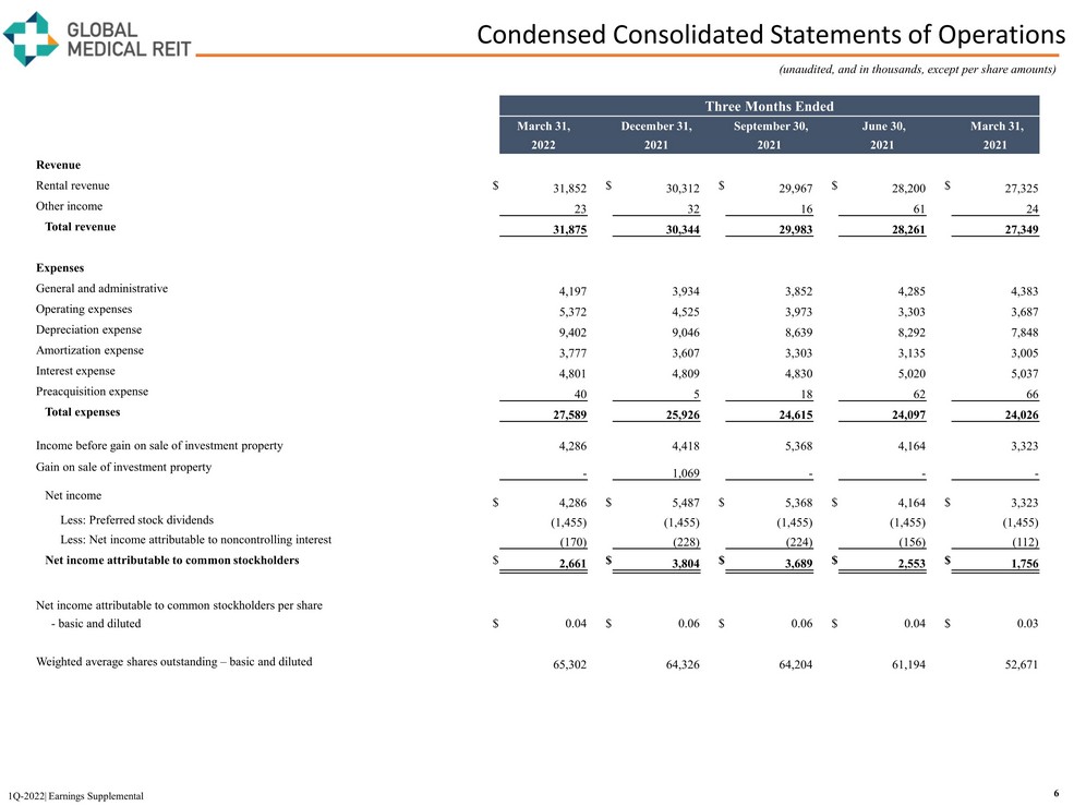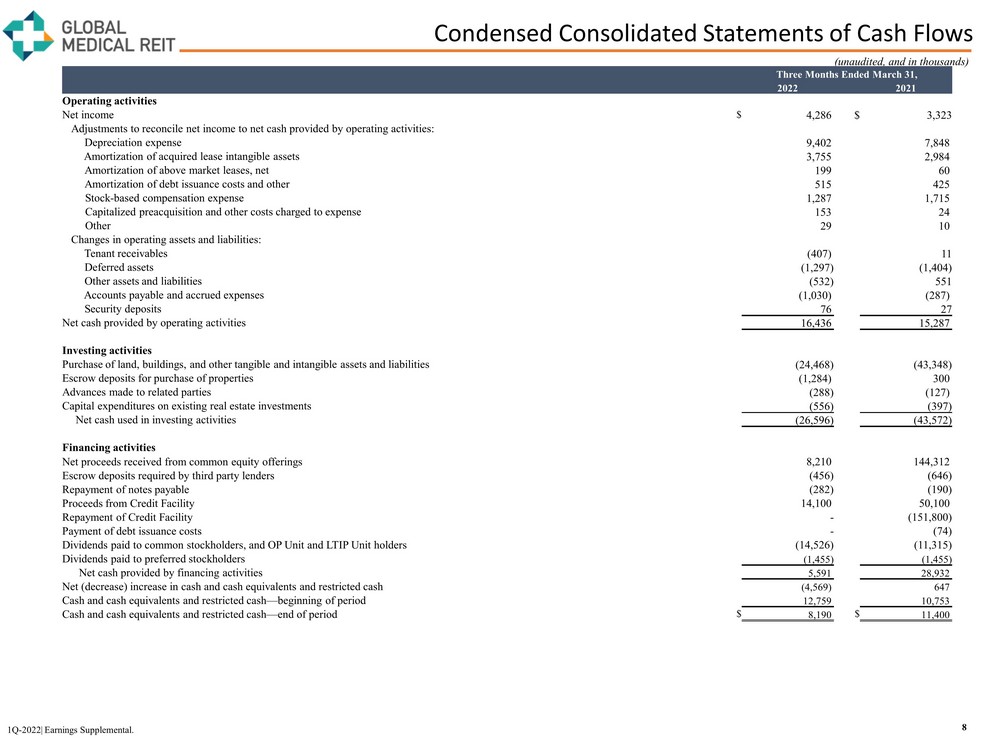 Condensed Consolidated Balance Sheets 7 1Q - 2022| Earnings Supplemental (unaudited, and in thousands) As of March 31 December 31 September 30, June 30, March 31, 2022 2021 2021 2021 2021 Assets Investment in real estate: Land $ 155,529 $ 152,060 $ 149,249 $ 145,424 $ 133,040 Building 1,002,087 985,091 964,169 931,510 883,901 Site improvements 19,596 19,021 18,017 17,011 15,669 Tenant improvements 60,154 58,900 56,156 53,730 50,596 Acquired lease intangible assets 130,790 127,931 123,918 112,649 103,269 1,368,156 1,343,003 1,311,509 1,260,324 1,186,475 Less: accumulated depreciation and amortization (157,132) (143,255) (130,284) (117,720) (105,779) Investment in real estate, net 1,211,024 1,199,748 1,181,225 1,142,604 1,080,696 Cash and cash equivalents 1,854 7,213 6,030 5,821 5,304 Restricted cash 6,336 5,546 5,839 6,549 6,096 Tenant receivables, net 6,477 6,070 5,126 4,886 5,585 Due from related parties 451 163 275 265 229 Escrow deposits 7,697 5,957 5,970 5,531 5,163 Deferred assets 26,714 25,417 24,422 23,050 21,676 Derivative asset 12,692 1,236 219 137 136 Goodwill 5,903 5,903 5,903 5,903 5,903 Other assets 6,345 6,232 8,297 5,219 5,530 Total assets $ 1,285,493 $ 1,263,485 $ 1,243,306 $ 1,199,965 $ 1,136,318 Liabilities and Equity Liabilities: Credit Facility, net $ 529,130 $ 514,567 $ 497,203 $ 442,140 $ 420,216 Notes payable, net 56,919 57,162 57,397 64,620 64,810 Accounts payable and accrued expenses 9,272 10,344 11,065 8,080 7,230 Dividends payable 15,823 15,668 15,309 15,251 14,482 Security deposits 4,616 4,540 4,600 4,385 4,367 Derivative liability 1,865 7,790 12,070 13,814 14,603 Other liabilities 7,090 7,709 7,104 5,983 6,793 Acquired lease intangible liability, net 8,161 8,128 8,333 8,437 7,998 Total liabilities 632,876 625,908 613,081 562,710 540,499 Equity: Preferred stock ($77,625 liquidation preference) 74,959 74,959 74,959 74,959 74,959 Common stock 65 65 64 64 61 Additional paid - in capital 720,306 711,414 700,206 700,038 648,949 Accumulated deficit (168,089) (157,017) (147,562) (138,088) (127,480) Accumulated other comprehensive income (loss) 10,757 (6,636) (11,946) (13,784) (14,588) Total Global Medical REIT Inc. stockholders' equity 637,998 622,785 615,721 623,189 581,901 Noncontrolling interest 14,619 14,792 14,504 14,066 13,918 Total equity 652,617 637,577 630,225 637,255 595,819 Total liabilities and equity $ 1,285,493 $ 1,263,485 $ 1,243,306 $ 1,199,965 $ 1,136,318