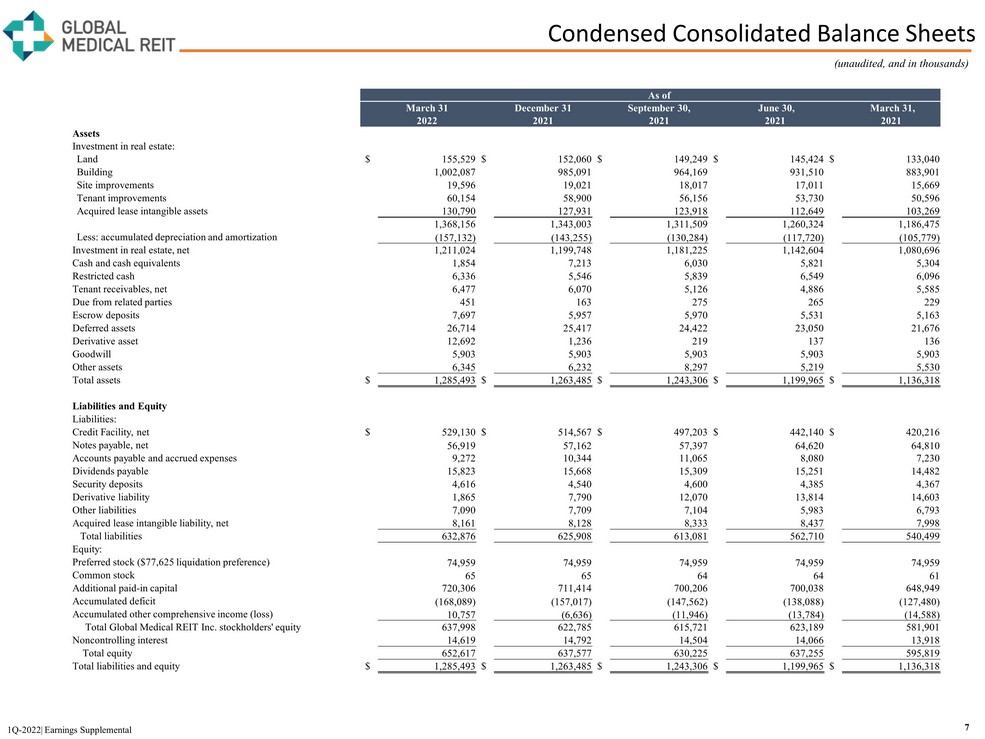 Condensed Consolidated Statements of Operations 6 1Q - 2022| Earnings Supplemental (unaudited, and in thousands, except per share amounts) Three Months Ended March 31, December 31, September 30, June 30, March 31, 2022 2021 2021 2021 2021 Revenue Rental revenue $ 31,852 $ 30,312 $ 29,967 $ 28,200 $ 27,325 Other income 23 32 16 61 24 Total revenue 31,875 30,344 29,983 28,261 27,349 Expenses General and administrative 4,197 3,934 3,852 4,285 4,383 Operating expenses 5,372 4,525 3,973 3,303 3,687 Depreciation expense 9,402 9,046 8,639 8,292 7,848 Amortization expense 3,777 3,607 3,303 3,135 3,005 Interest expense 4,801 4,809 4,830 5,020 5,037 Preacquisition expense 40 5 18 62 66 Total expenses 27,589 25,926 24,615 24,097 24,026 Income before gain on sale of investment property 4,286 4,418 5,368 4,164 3,323 Gain on sale of investment property - 1,069 - - - Net income $ 4,286 $ 5,487 $ 5,368 $ 4,164 $ 3,323 Less: Preferred stock dividends (1,455) (1,455) (1,455) (1,455) (1,455) Less: Net income attributable to noncontrolling interest (170) (228) (224) (156) (112) Net income attributable to common stockholders $ 2,661 $ 3,804 $ 3,689 $ 2,553 $ 1,756 Net income attributable to common stockholders per share - basic and diluted $ 0.04 $ 0.06 $ 0.06 $ 0.04 $ 0.03 Weighted average shares outstanding – basic and diluted 65,302 64,326 64,204 61,194 52,671
