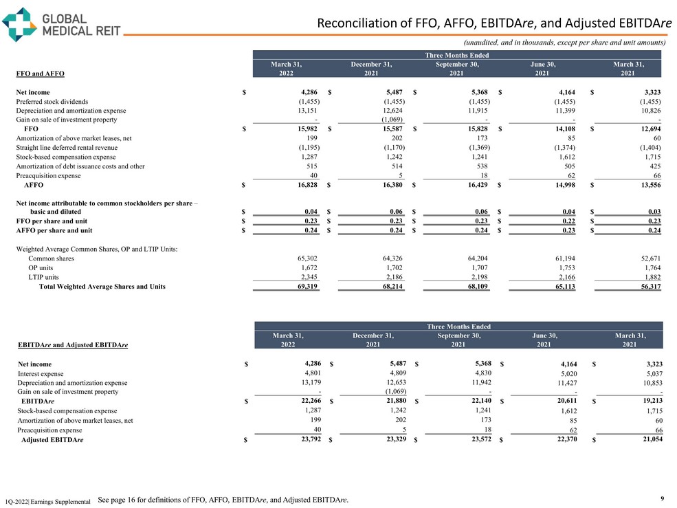 Condensed Consolidated Statements of Cash Flows 8 (unaudited, and in thousands) Three Months Ended March 31, 2022 2021 Operating activities Net income $ 4,286 $ 3,323 Adjustments to reconcile net income to net cash provided by operating activities: Depreciation expense 9,402 7,848 Amortization of acquired lease intangible assets 3,755 2,984 Amortization of above market leases, net 199 60 Amortization of debt issuance costs and other 515 425 Stock - based compensation expense 1,287 1,715 Capitalized preacquisition and other costs charged to expense 153 24 Other 29 10 Changes in operating assets and liabilities: Tenant receivables (407) 11 Deferred assets (1,297) (1,404) Other assets and liabilities (532) 551 Accounts payable and accrued expenses (1,030) (287) Security deposits 76 27 Net cash provided by operating activities 16,436 15,287 Investing activities Purchase of land, buildings, and other tangible and intangible assets and liabilities (24,468) (43,348) Escrow deposits for purchase of properties (1,284) 300 Advances made to related parties (288) (127) Capital expenditures on existing real estate investments (556) (397) Net cash used in investing activities (26,596) (43,572) Financing activities Net proceeds received from common equity offerings 8,210 144,312 Escrow deposits required by third party lenders (456) (646) Repayment of notes payable (282) (190) Proceeds from Credit Facility 14,100 50,100 Repayment of Credit Facility - (151,800) Payment of debt issuance costs - (74) Dividends paid to common stockholders, and OP Unit and LTIP Unit holders (14,526) (11,315) Dividends paid to preferred stockholders (1,455) (1,455) Net cash provided by financing activities 5,591 28,932 Net (decrease) increase in cash and cash equivalents and restricted cash (4,569) 647 Cash and cash equivalents and restricted cash — beginning of period 12,759 10,753 Cash and cash equivalents and restricted cash — end of period $ 8,190 $ 11,400 1Q - 2022| Earnings Supplemental.