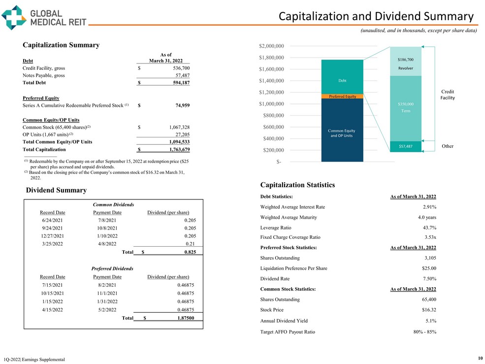 Reconciliation of FFO, AFFO, EBITDA re , and Adjusted EBITDA re 9 1Q - 2022| Earnings Supplemental (unaudited, and in thousands, except per share and unit amounts) Three Months Ended March 31, December 31, September 30, June 30, March 31, FFO and AFFO 2022 2021 2021 2021 2021 Net income $ 4,286 $ 5,487 $ 5,368 $ 4,164 $ 3,323 Preferred stock dividends (1,455) (1,455) (1,455) (1,455) (1,455) Depreciation and amortization expense 13,151 12,624 11,915 11,399 10,826 Gain on sale of investment property - (1,069) - - - FFO $ 15,982 $ 15,587 $ 15,828 $ 14,108 $ 12,694 Amortization of above market leases, net 199 202 173 85 60 Straight line deferred rental revenue (1,195) (1,170) (1,369) (1,374) (1,404) Stock - based compensation expense 1,287 1,242 1,241 1,612 1,715 Amortization of debt issuance costs and other 515 514 538 505 425 Preacquisition expense 40 5 18 62 66 AFFO $ 16,828 $ 16,380 $ 16,429 $ 14,998 $ 13,556 Net income attributable to common stockholders per share – basic and diluted $ 0.04 $ 0.06 $ 0.06 $ 0.04 $ 0.03 FFO per share and unit $ 0.23 $ 0.23 $ 0.23 $ 0.22 $ 0.23 AFFO per share and unit $ 0.24 $ 0.24 $ 0.24 $ 0.23 $ 0.24 Weighted Average Common Shares, OP and LTIP Units: Common shares 65,302 64,326 64,204 61,194 52,671 OP units 1,672 1,702 1,707 1,753 1,764 LTIP units 2,345 2,186 2,198 2,166 1,882 Total Weighted Average Shares and Units 69,319 68,214 68,109 65,113 56,317 Three Months Ended March 31, December 31, September 30, June 30, March 31, EBITDA re and Adjusted EBITDA re 2022 2021 2021 2021 2021 Net income $ 4,286 $ 5,487 $ 5,368 $ 4,164 $ 3,323 Interest expense 4,801 4,809 4,830 5,020 5,037 Depreciation and amortization expense 13,179 12,653 11,942 11,427 10,853 Gain on sale of investment property - (1,069) - - - EBITDA re $ 22,266 $ 21,880 $ 22,140 $ 20,611 $ 19,213 Stock - based compensation expense 1,287 1,242 1,241 1,612 1,715 Amortization of above market leases, net 199 202 173 85 60 Preacquisition expense 40 5 18 62 66 Adjusted EBITDA re $ 23,792 $ 23,329 $ 23,572 $ 22,370 $ 21,054 See page 16 for definitions of FFO, AFFO, EBITDA re , and Adjusted EBITDA re .