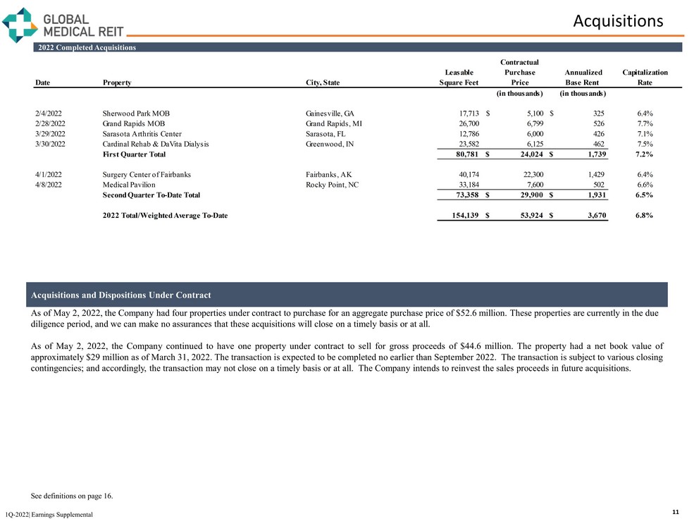 Acquisitions 11 2022 Completed Acquisitions Acquisitions and Dispositions Under Contract As of May 2, 2022, the Company had four properties under contract to purchase for an aggregate purchase price of $52.6 millio n. These properties are currently in the due diligence period, and we can make no assurances that these acquisitions will close on a timely basis or at all. As of May 2 , 2022 , the Company continued to have one property under contract to sell for gross proceeds of $ 44 . 6 million . The property had a net book value of approximately $ 29 million as of March 31 , 2022 . The transaction is expected to be completed no earlier than September 2022 . The transaction is subject to various closing contingencies ; and accordingly, the transaction may not close on a timely basis or at all . The Company intends to reinvest the sales proceeds in future acquisitions . See definitions on page 16 . 1Q - 2022| Earnings Supplemental Contractual Leasable Purchase Annualized Capitalization Date Property City, State Square Feet Price Base Rent Rate (in thousands) (in thousands) 2/4/2022 Sherwood Park MOB Gainesville, GA 17,713 $ 5,100 $ 325 6.4% 2/28/2022 Grand Rapids MOB Grand Rapids, MI 26,700 6,799 526 7.7% 3/29/2022 Sarasota Arthritis Center Sarasota, FL 12,786 6,000 426 7.1% 3/30/2022 Cardinal Rehab & DaVita Dialysis Greenwood, IN 23,582 6,125 462 7.5% First Quarter Total 80,781 $ 24,024 $ 1,739 7.2% 4/1/2022 Surgery Center of Fairbanks Fairbanks, AK 40,174 22,300 1,429 6.4% 4/8/2022 Medical Pavilion Rocky Point, NC 33,184 7,600 502 6.6% Second Quarter To-Date Total 73,358 $ 29,900 $ 1,931 6.5% 2022 Total/Weighted Average To-Date 154,139 $ 53,924 $ 3,670 6.8%