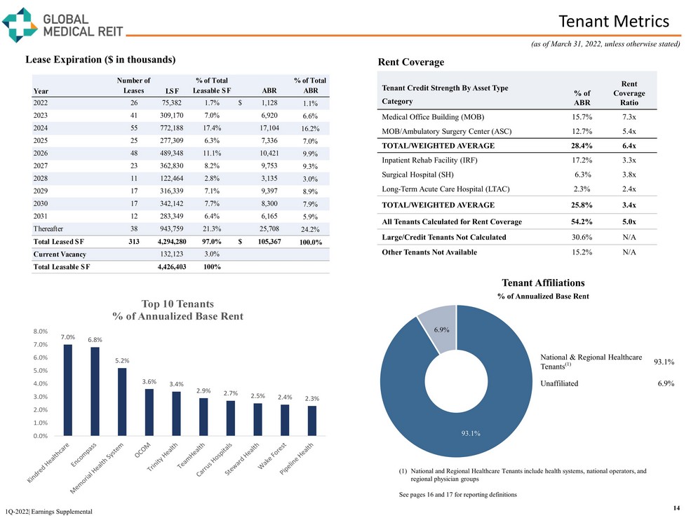 Portfolio Update (continued) 13 1Q - 2022| Earnings Supplemental (1) Other includes Office (2.5%), Acute Hospital (2.3%), LTACH (2.3%), Behavioral Hospital (1.3%), and FSED (0.9%). *See page 16 fo r reporting definitions. MOB Total – 65.7% IRF – 18.7% S.H. – 6.3% Other – 9.3% Texas 18.8% Florida 11.0% Ohio 7.8% Oklahoma 6.8% Pennsylvania 6.2% Arizona 6.1% Illinois 5.5% Michigan 4.4% Tennessee 3.0% Virginia 2.9% Other 27.5% TX 18.8% FL 11.0% OH 7.8% OK 6.8% PA 6.2% AZ 6.1% IL 5.5% All Others 27.5% Top 10 States % of Annualized Base Rent Asset Types % of Annualized Base Rent (as of March 31, 2022) MOB Total 65.7% MOB 44.1% MOB/ASC 16.9% MOB/Imaging/ER 4.7% IRF 18.7% Surgical Hospital 6.3% Other (1) 9.3%