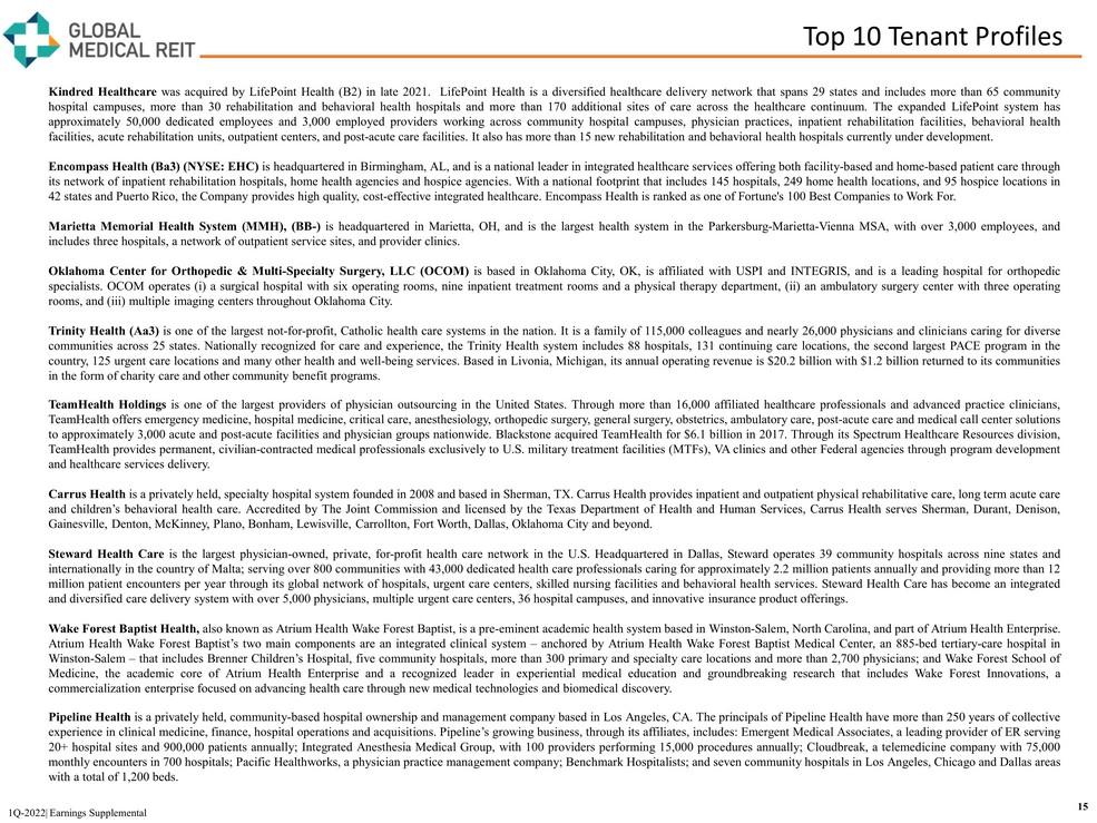 Top 10 Tenant Profiles 15 1Q - 2022| Earnings Supplemental Kindred Healthcare was acquired by LifePoint Health (B 2 ) in late 2021 . LifePoint Health is a diversified healthcare delivery network that spans 29 states and includes more than 65 community hospital campuses, more than 30 rehabilitation and behavioral health hospitals and more than 170 additional sites of care across the healthcare continuum . The expanded LifePoint system has approximately 50 , 000 dedicated employees and 3 , 000 employed providers working across community hospital campuses, physician practices, inpatient rehabilitation facilities, behavioral health facilities, acute rehabilitation units, outpatient centers, and post - acute care facilities . It also has more than 15 new rehabilitation and behavioral health hospitals currently under development . Encompass Health (Ba 3 ) (NYSE : EHC) is headquartered in Birmingham, AL, and is a national leader in integrated healthcare services offering both facility - based and home - based patient care through its network of inpatient rehabilitation hospitals, home health agencies and hospice agencies . With a national footprint that includes 145 hospitals, 249 home health locations, and 95 hospice locations in 42 states and Puerto Rico, the Company provides high quality, cost - effective integrated healthcare . Encompass Health is ranked as one of Fortune's 100 Best Companies to Work For . Marietta Memorial Health System (MMH), (BB - ) is headquartered in Marietta, OH, and is the largest health system in the Parkersburg - Marietta - Vienna MSA, with over 3 , 000 employees, and includes three hospitals, a network of outpatient service sites, and provider clinics . Oklahoma Center for Orthopedic & Multi - Specialty Surgery, LLC (OCOM) is based in Oklahoma City, OK, is affiliated with USPI and INTEGRIS, and is a leading hospital for orthopedic specialists . OCOM operates ( i ) a surgical hospital with six operating rooms, nine inpatient treatment rooms and a physical therapy department, (ii) an ambulatory surgery center with three operating rooms, and (iii) multiple imaging centers throughout Oklahoma City . Trinity Health (Aa 3 ) is one of the largest not - for - profit, Catholic health care systems in the nation . It is a family of 115 , 000 colleagues and nearly 26 , 000 physicians and clinicians caring for diverse communities across 25 states . Nationally recognized for care and experience, the Trinity Health system includes 88 hospitals, 131 continuing care locations, the second largest PACE program in the country, 125 urgent care locations and many other health and well - being services . Based in Livonia, Michigan, its annual operating revenue is $ 20 . 2 billion with $ 1 . 2 billion returned to its communities in the form of charity care and other community benefit programs . TeamHealth Holdings is one of the largest providers of physician outsourcing in the United States . Through more than 16 , 000 affiliated healthcare professionals and advanced practice clinicians, TeamHealth offers emergency medicine, hospital medicine, critical care, anesthesiology, orthopedic surgery, general surgery, obstetrics, ambulatory care, post - acute care and medical call center solutions to approximately 3 , 000 acute and post - acute facilities and physician groups nationwide . Blackstone acquired TeamHealth for $ 6 . 1 billion in 2017 . Through its Spectrum Healthcare Resources division, TeamHealth provides permanent, civilian - contracted medical professionals exclusively to U . S . military treatment facilities (MTFs), VA clinics and other Federal agencies through program development and healthcare services delivery . Carrus Health is a privately held, specialty hospital system founded in 2008 and based in Sherman, TX . Carrus Health provides inpatient and outpatient physical rehabilitative care, long term acute care and children’s behavioral health care . Accredited by The Joint Commission and licensed by the Texas Department of Health and Human Services, Carrus Health serves Sherman, Durant, Denison, Gainesville, Denton, McKinney, Plano, Bonham, Lewisville, Carrollton, Fort Worth, Dallas, Oklahoma City and beyond . Steward Health Care is the largest physician - owned, private, for - profit health care network in the U . S . Headquartered in Dallas, Steward operates 39 community hospitals across nine states and internationally in the country of Malta ; serving over 800 communities with 43 , 000 dedicated health care professionals caring for approximately 2 . 2 million patients annually and providing more than 12 million patient encounters per year through its global network of hospitals, urgent care centers, skilled nursing facilities and behavioral health services . Steward Health Care has become an integrated and diversified care delivery system with over 5 , 000 physicians, multiple urgent care centers, 36 hospital campuses, and innovative insurance product offerings . Wake Forest Baptist Health, also known as Atrium Health Wake Forest Baptist, is a pre - eminent academic health system based in Winston - Salem, North Carolina, and part of Atrium Health Enterprise . Atrium Health Wake Forest Baptist’s two main components are an integrated clinical system – anchored by Atrium Health Wake Forest Baptist Medical Center, an 885 - bed tertiary - care hospital in Winston - Salem – that includes Brenner Children’s Hospital, five community hospitals, more than 300 primary and specialty care locations and more than 2 , 700 physicians ; and Wake Forest School of Medicine, the academic core of Atrium Health Enterprise and a recognized leader in experiential medical education and groundbreaking research that includes Wake Forest Innovations, a commercialization enterprise focused on advancing health care through new medical technologies and biomedical discovery . Pipeline Health is a privately held, community-based hospital ownership and management company based in Los Angeles, CA