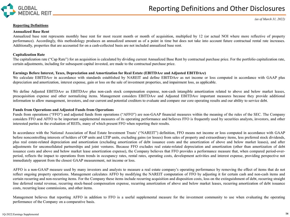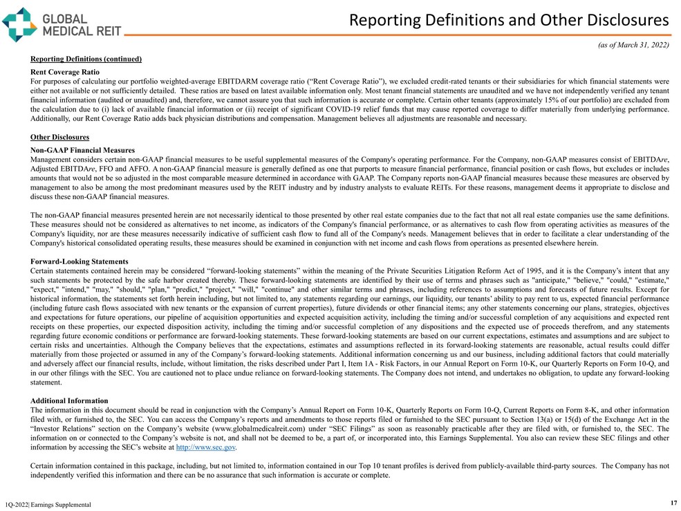 Reporting Definitions and Other Disclosures Reporting Definitions (continued) Rent Coverage Ratio For purposes of calculating our portfolio weighted - average EBITDARM coverage ratio (“Rent Coverage Ratio”), we excluded credit - rated tenants or their subsidiaries for which financial statements were either not available or not sufficiently detailed . These ratios are based on latest available information only . Most tenant financial statements are unaudited and we have not independently verified any tenant financial information (audited or unaudited) and, therefore, we cannot assure you that such information is accurate or complete . Certain other tenants (approximately 15 % of our portfolio) are excluded from the calculation due to (i) lack of available financial information or (ii) receipt of significant COVID - 19 relief funds that may cause reported coverage to differ materially from underlying performance . Additionally, our Rent Coverage Ratio adds back physician distributions and compensation . Management believes all adjustments are reasonable and necessary . Other Disclosures Non - GAAP Financial Measures Management considers certain non - GAAP financial measures to be useful supplemental measures of the Company's operating performance . For the Company, non - GAAP measures consist of EBITDA re , Adjusted EBITDA re , FFO and AFFO . A non - GAAP financial measure is generally defined as one that purports to measure financial performance, financial position or cash flows, but excludes or includes amounts that would not be so adjusted in the most comparable measure determined in accordance with GAAP . The Company reports non - GAAP financial measures because these measures are observed by management to also be among the most predominant measures used by the REIT industry and by industry analysts to evaluate REITs . For these reasons, management deems it appropriate to disclose and discuss these non - GAAP financial measures . The non - GAAP financial measures presented herein are not necessarily identical to those presented by other real estate companies due to the fact that not all real estate companies use the same definitions . These measures should not be considered as alternatives to net income, as indicators of the Company's financial performance, or as alternatives to cash flow from operating activities as measures of the Company's liquidity, nor are these measures necessarily indicative of sufficient cash flow to fund all of the Company's needs . Management believes that in order to facilitate a clear understanding of the Company's historical consolidated operating results, these measures should be examined in conjunction with net income and cash flows from operations as presented elsewhere herein . Forward - Looking Statements Certain statements contained herein may be considered “forward - looking statements” within the meaning of the Private Securities Litigation Reform Act of 1995 , and it is the Company’s intent that any such statements be protected by the safe harbor created thereby . These forward - looking statements are identified by their use of terms and phrases such as "anticipate," "believe," "could," "estimate," "expect," "intend," "may," "should," "plan," "predict," "project," "will," "continue" and other similar terms and phrases, including references to assumptions and forecasts of future results . Except for historical information, the statements set forth herein including, but not limited to, any statements regarding our earnings, our liquidity, our tenants’ ability to pay rent to us, expected financial performance (including future cash flows associated with new tenants or the expansion of current properties), future dividends or other financial items ; any other statements concerning our plans, strategies, objectives and expectations for future operations, our pipeline of acquisition opportunities and expected acquisition activity, including the timing and/or successful completion of any acquisitions and expected rent receipts on these properties, our expected disposition activity, including the timing and/or successful completion of any dispositions and the expected use of proceeds therefrom, and any statements regarding future economic conditions or performance are forward - looking statements . These forward - looking statements are based on our current expectations, estimates and assumptions and are subject to certain risks and uncertainties . Although the Company believes that the expectations, estimates and assumptions reflected in its forward - looking statements are reasonable, actual results could differ materially from those projected or assumed in any of the Company’s forward - looking statements . Additional information concerning us and our business, including additional factors that could materially and adversely affect our financial results, include, without limitation, the risks described under Part I, Item 1 A - Risk Factors, in our Annual Report on Form 10 - K, our Quarterly Reports on Form 10 - Q, and in our other filings with the SEC . You are cautioned not to place undue reliance on forward - looking statements . The Company does not intend, and undertakes no obligation, to update any forward - looking statement . Additional Information The information in this document should be read in conjunction with the Company’s Annual Report on Form 10 - K, Quarterly Reports on Form 10 - Q, Current Reports on Form 8 - K, and other information filed with, or furnished to, the SEC . You can access the Company’s reports and amendments to those reports filed or furnished to the SEC pursuant to Section 13 (a) or 15 (d) of the Exchange Act in the “Investor Relations” section on the Company’s website (www . globalmedicalreit . com) under “SEC Filings” as soon as reasonably practicable after they are filed with, or furnished to, the SEC . The information on or connected to the Company’s website is not, and shall not be de