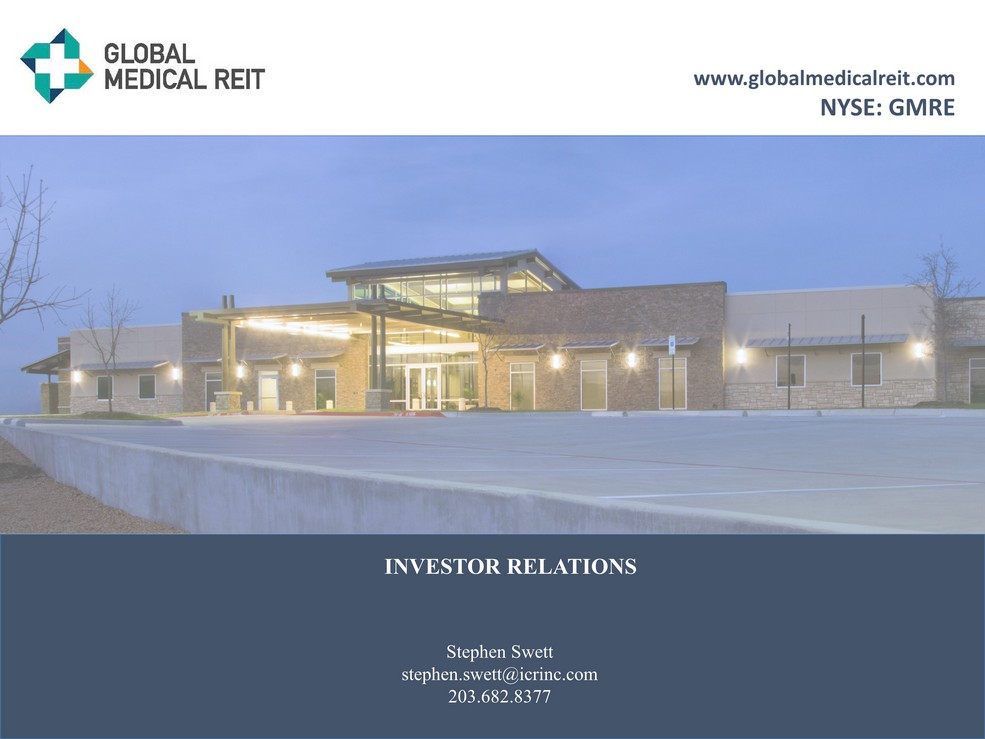 Stephen Swett stephen.swett@icrinc.com 203.682.8377 www.globalmedicalreit.com NYSE: GMRE INVESTOR RELATIONS