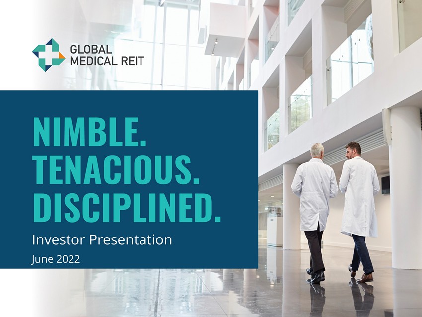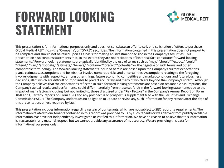 FORWARD LOOKING STATEMENT This presentation is for informational purposes only and does not constitute an offer to sell, or a solicitation of offers to pu rchase, Global Medical REIT Inc.’s (the “Company”, or “GMRE”) securities. The information contained in this presentation does not pur por t to be complete and should not be relied upon as a basis for making an investment decision in the Company’s securities. This presentation also contains statements that, to the extent they are not recitations of historical fact, constitute “forward - looki ng statements.” Forward - looking statements are typically identified by the use of terms such as “may,” “should,” “expect,” “could,” “intend,” “plan,” “anticipate,” “estimate,” “believe,” “continue,” “predict,” “potential” or the negative of such terms and o the r comparable terminology. The forward - looking statements included herein are based upon the Company’s current expectations, plans, estimates, assumptions and beliefs that involve numerous risks and uncertainties. Assumptions relating to the foregoin g involve judgments with respect to, among other things, future economic, competitive and market conditions and future business decisions, all of which are difficult or impossible to predict accurately and many of which are beyond the Company’s control. Al though the Company believes that the expectations reflected in such forward - looking statements are based on reasonable assumptions, the Company’s actual results and performance could differ materially from those set forth in the forward - looking statements due to t he impact of many factors including, but not limited to, those discussed under “Risk Factors” in the Company’s Annual Report on For m 10 - K and Quarterly Reports on Form 10 - Q and any prospectus or prospectus supplement filed with the Securities and Exchange Commission (“SEC”). The Company undertakes no obligation to update or revise any such information for any reason after the da te of this presentation, unless required by law. This presentation includes information regarding certain of our tenants, which are not subject to SEC reporting requirements. Th e information related to our tenants contained in this report was provided to us by such tenants or was derived from publicly a vai lable information. We have not independently investigated or verified this information. We have no reason to believe that this info rma tion is inaccurate in any material respect, but we cannot provide any assurance of its accuracy. We are providing this data for informational purposes only. 21