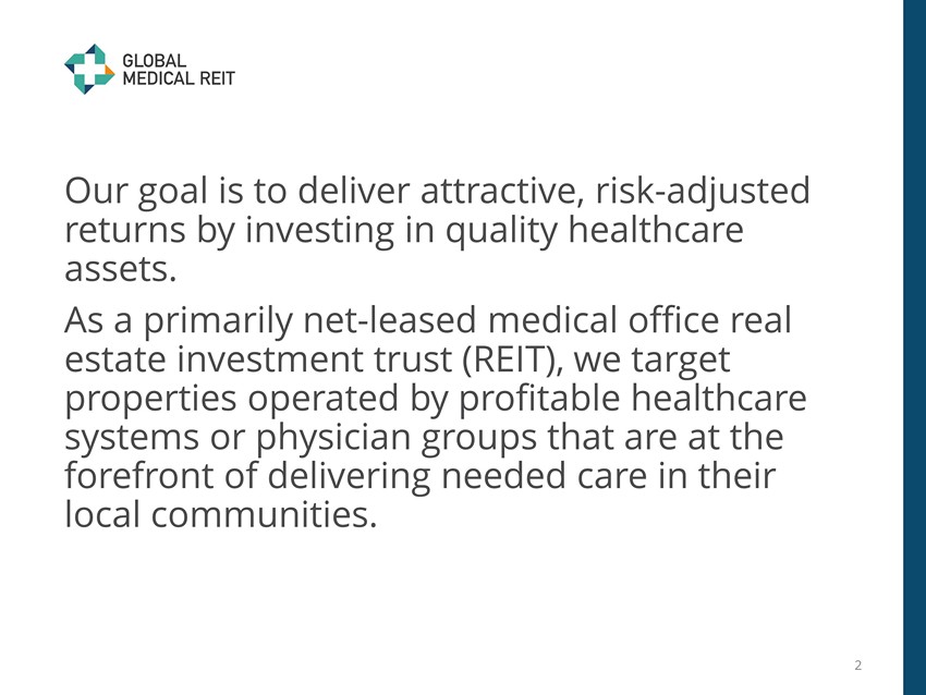 Our goal is to deliver attractive, risk - adjusted returns by investing in quality healthcare assets. As a primarily net - leased medical office real estate investment trust (REIT), we target properties operated by profitable healthcare systems or physician groups that are at the forefront of delivering needed care in their local communities. 2