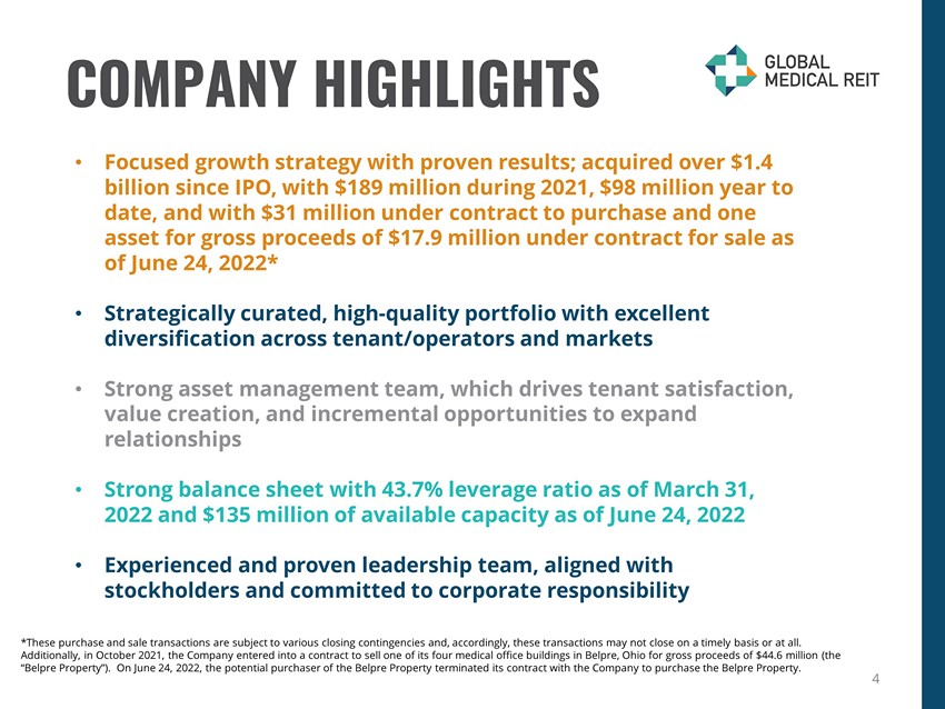3 “We continue to execute our strategic growth plans, operate through the uncertainty created by global instability, and source accretive opportunities to grow our portfolio even in a challenging acquisition environment.“ Jeffrey Busch Chairman, Chief Executive Officer and President