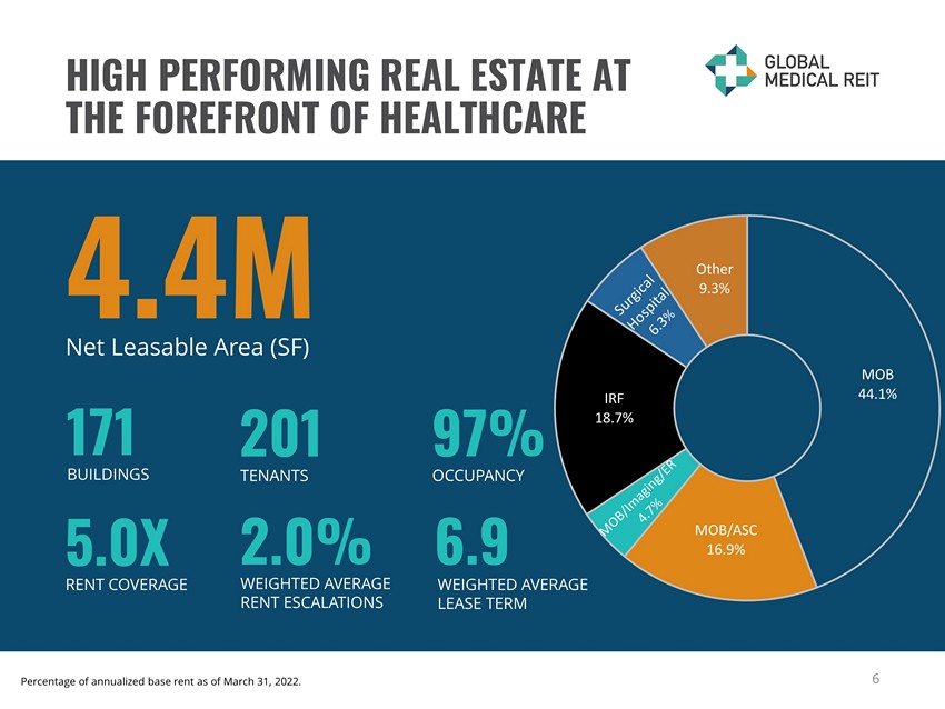 5 A STRATEGY THAT DELIVERS VALUE $1.4B Investments in Real Estate Gross $0.8B Market Cap* 7.8% Weighted Average Cap Rate 7.4% Dividend Yield* *Based on closing price of the Company’s common stock as of $11.39 on June 24, 2022